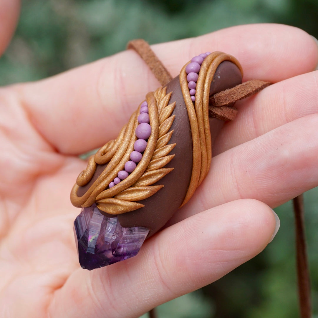 Handmade polymer clay sculpture around a beautiful chunk of amethyst.