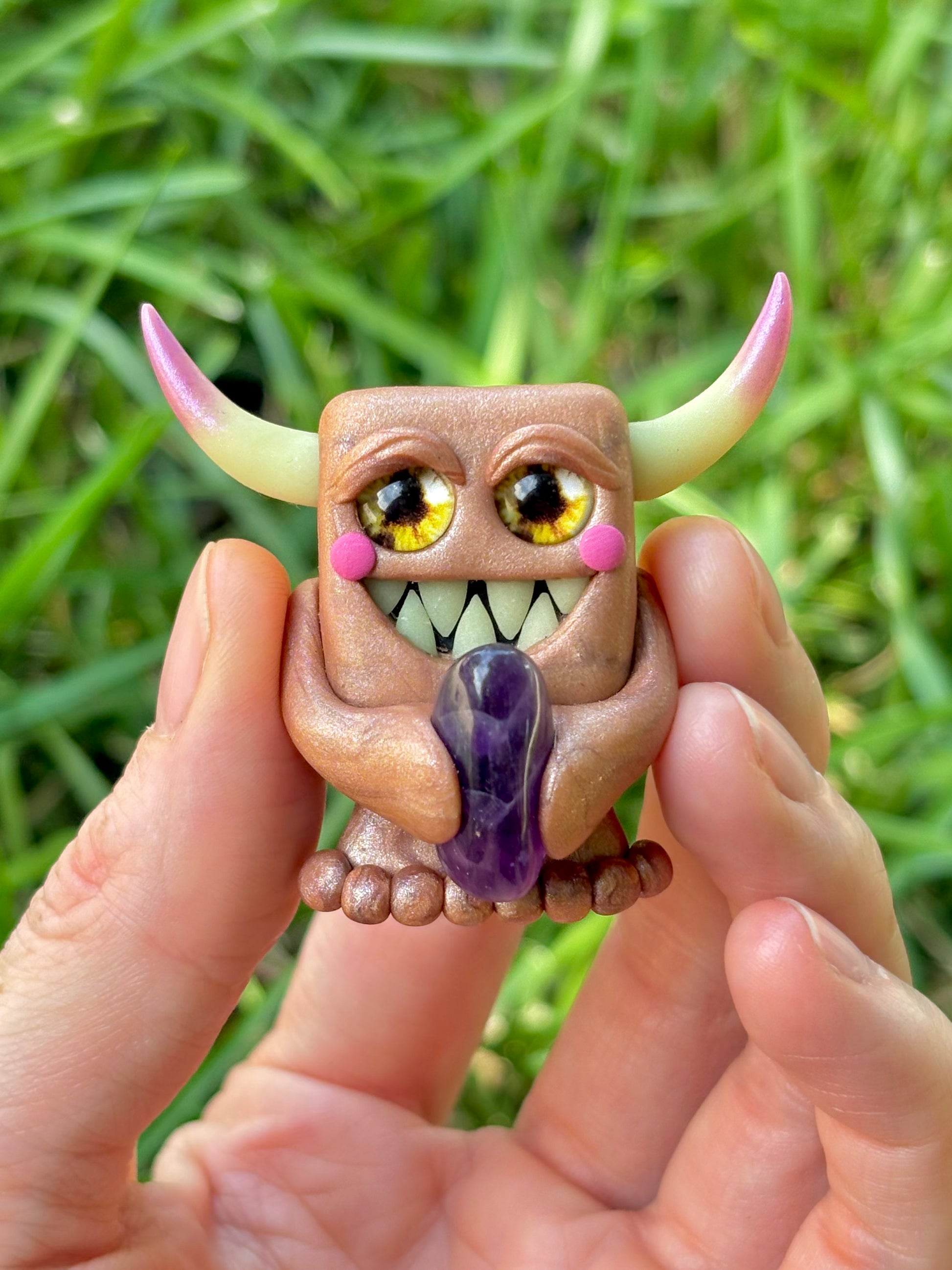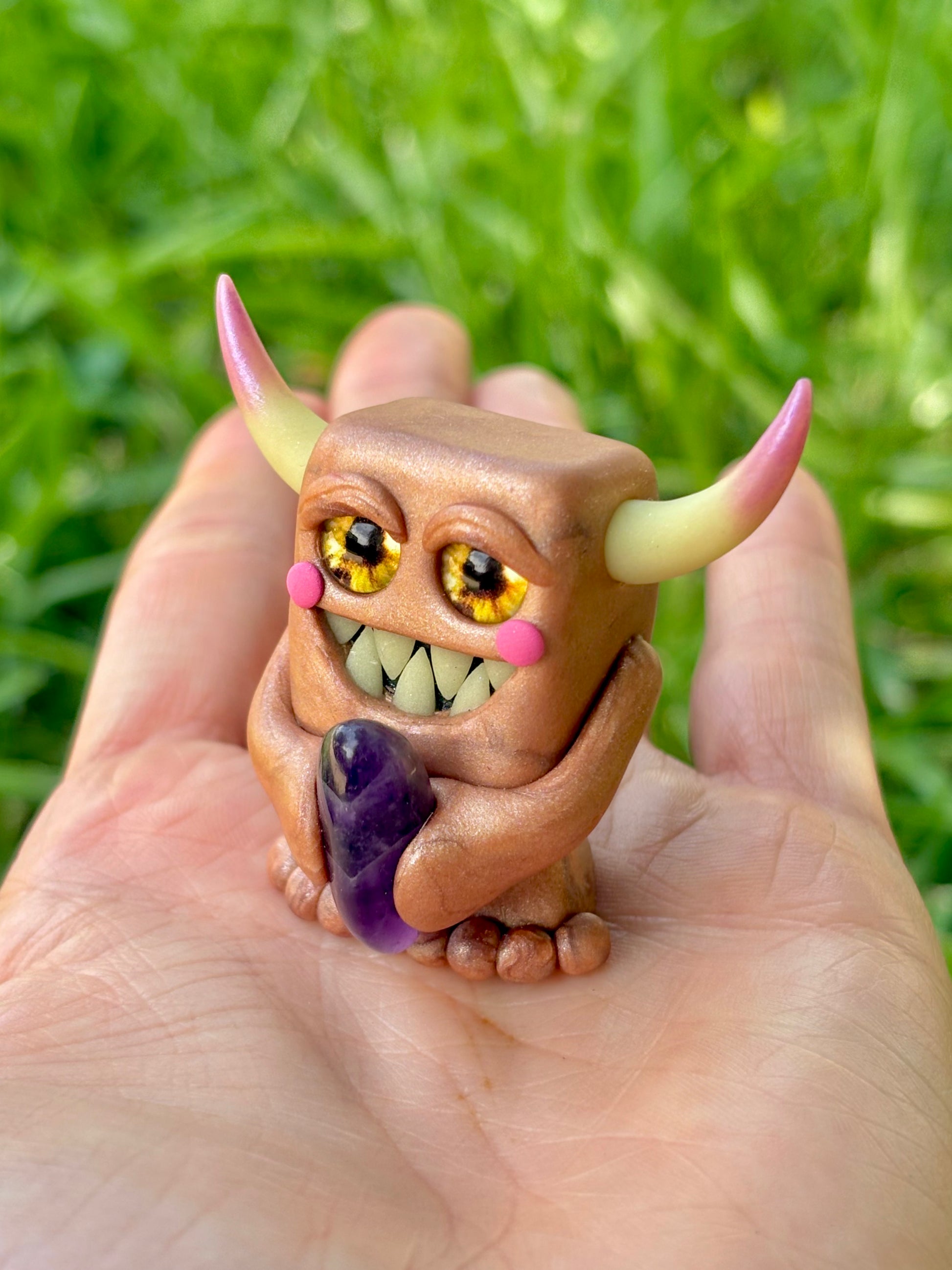 This handmade polymer clay Gem-lin figurine is holding a beautiful chunk of Amethyst.