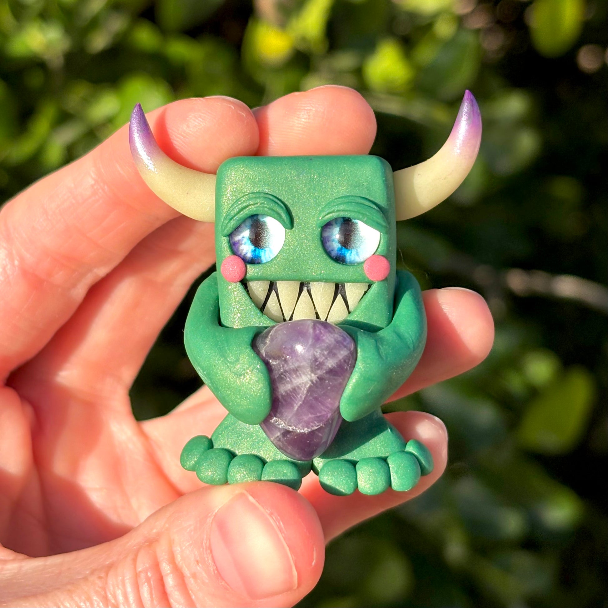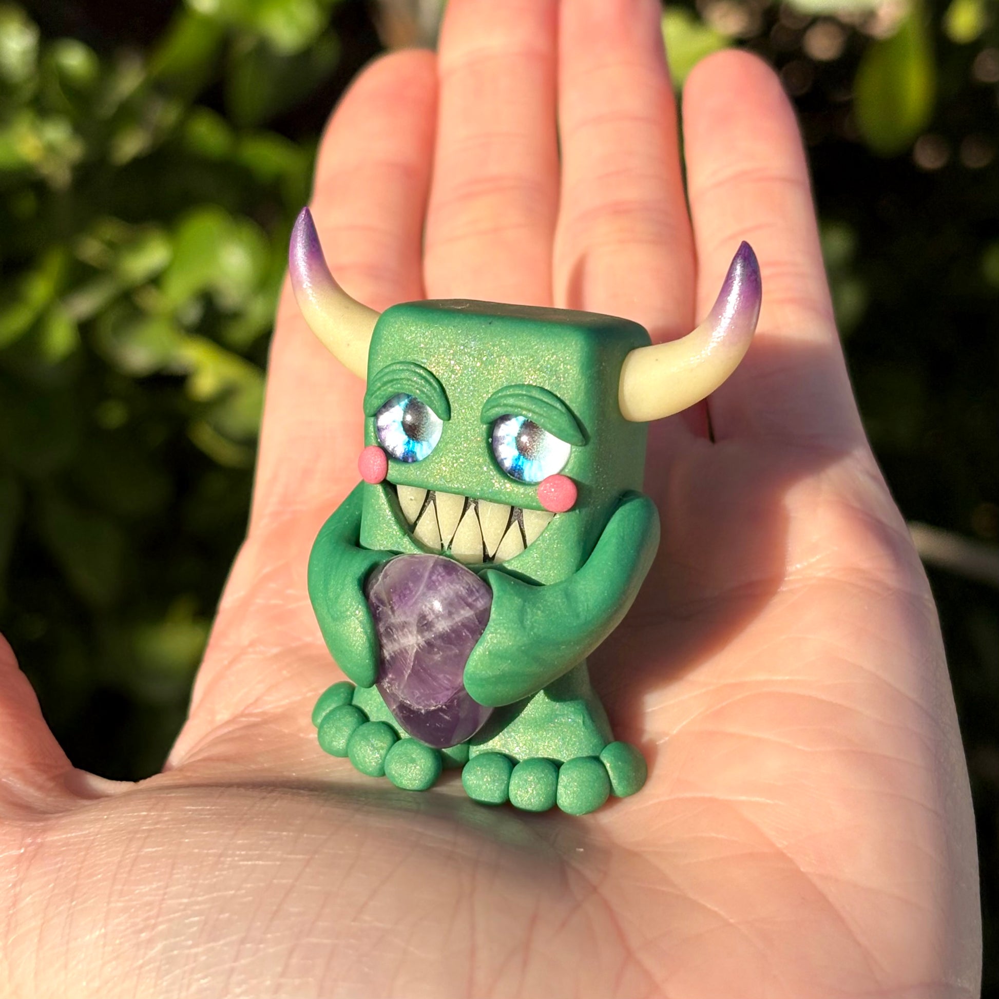 This handmade polymer clay Gem-lin figurine is holding a beautiful chunk of tumbled Amethyst.