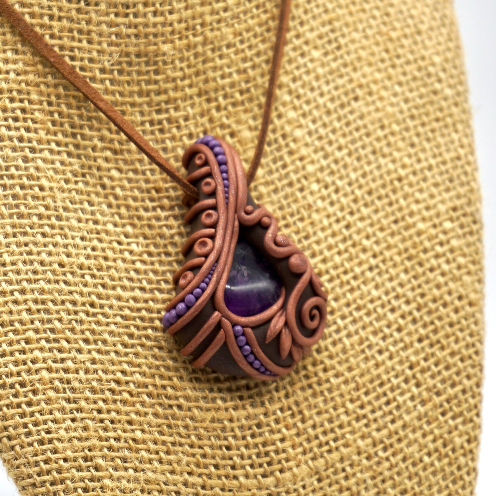 Amethyst wrapped in polymer clay. When held up to a light source, the deeper details and rich purple hues of the stone can truly be appreciated. Comes with suede cord.