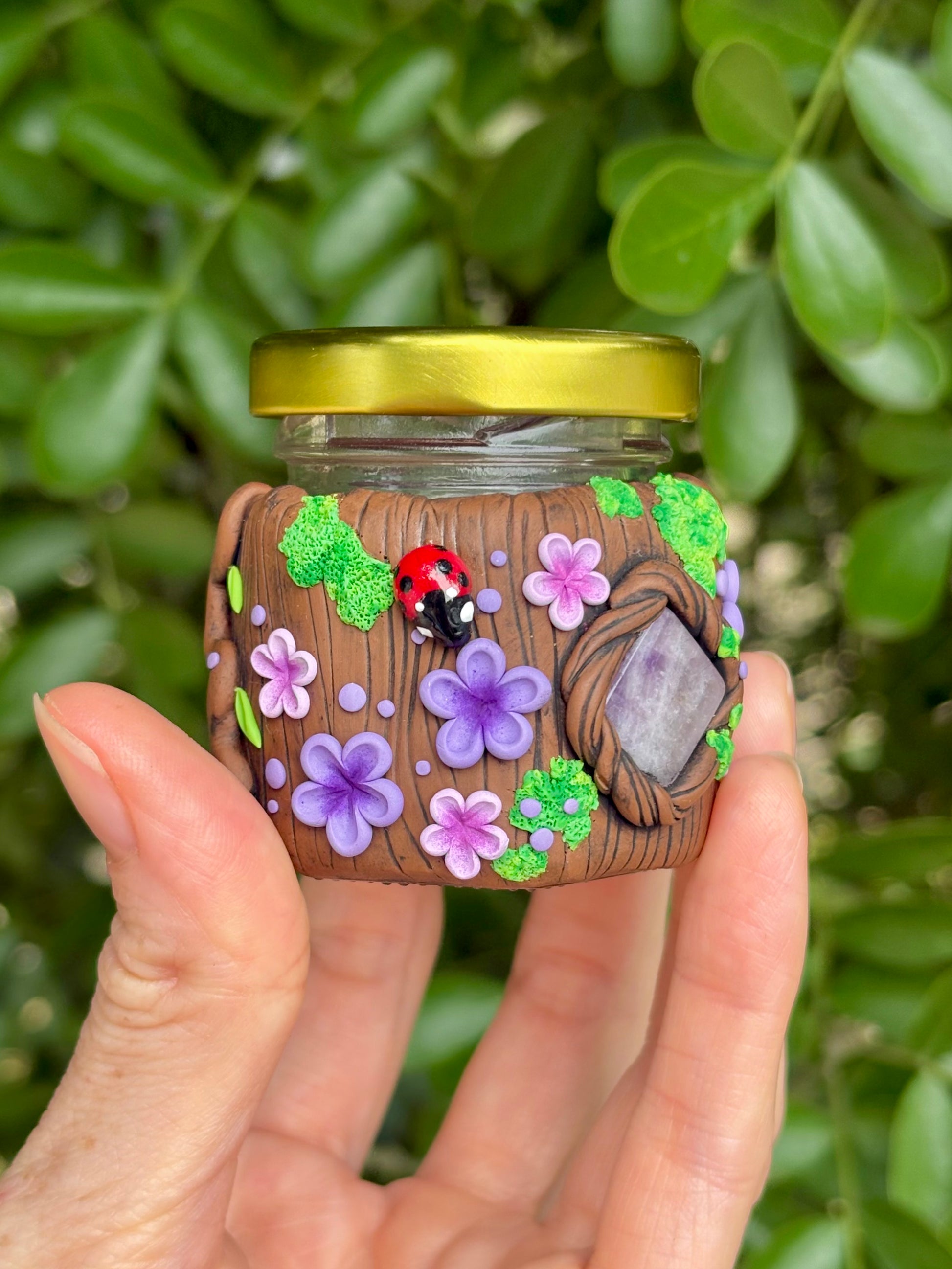 This woodland jar features a genuine amethyst, known for bringing peace, clarity, and balance. It’s surrounded by moss and vibrant purple polymer clay flowers.