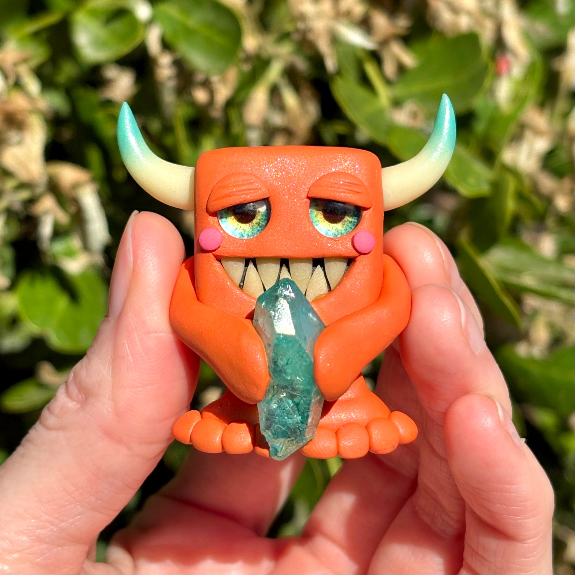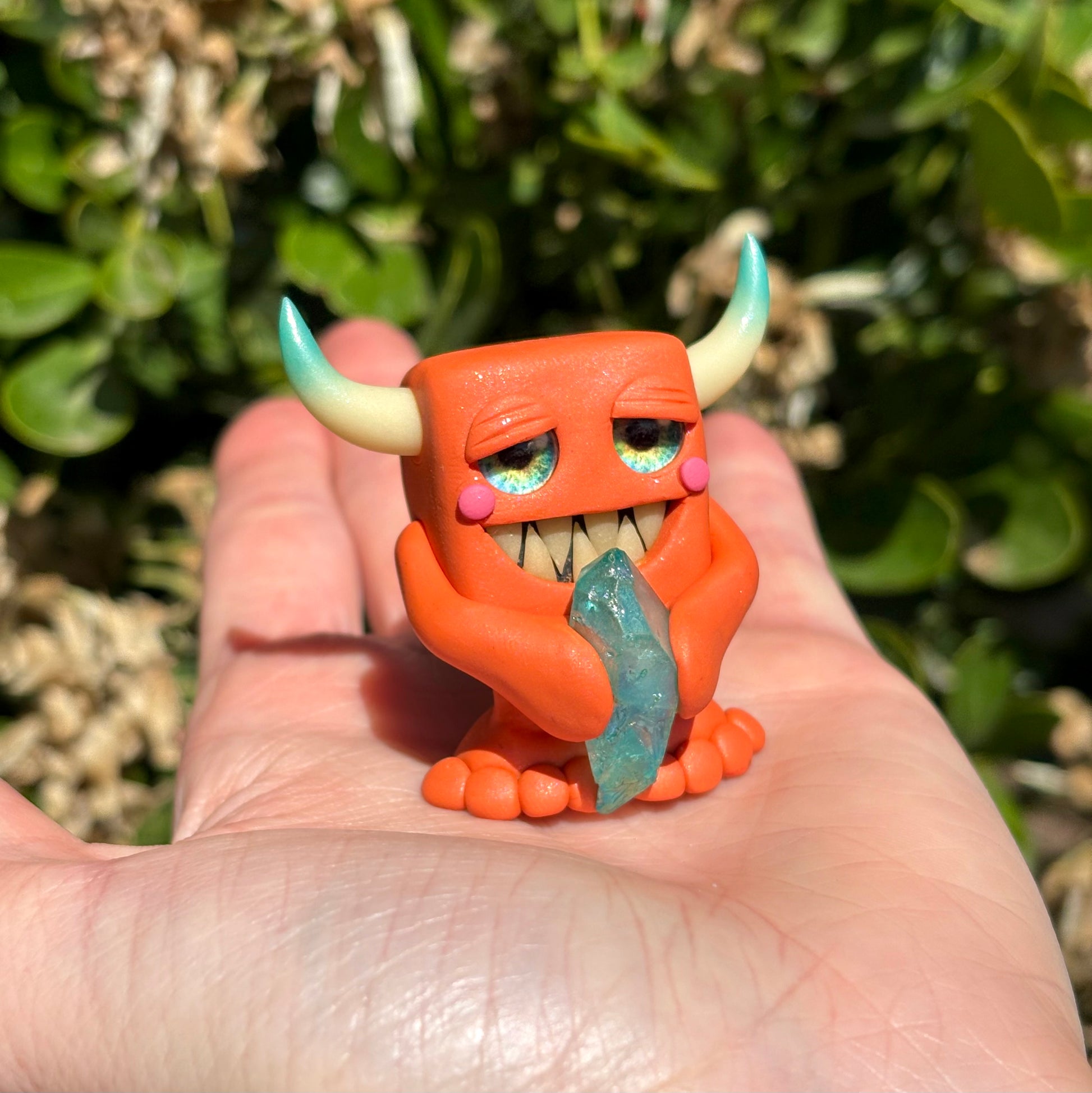This handmade polymer clay Gem-lin figurine is holding a beautiful turquoise Aura Quartz.