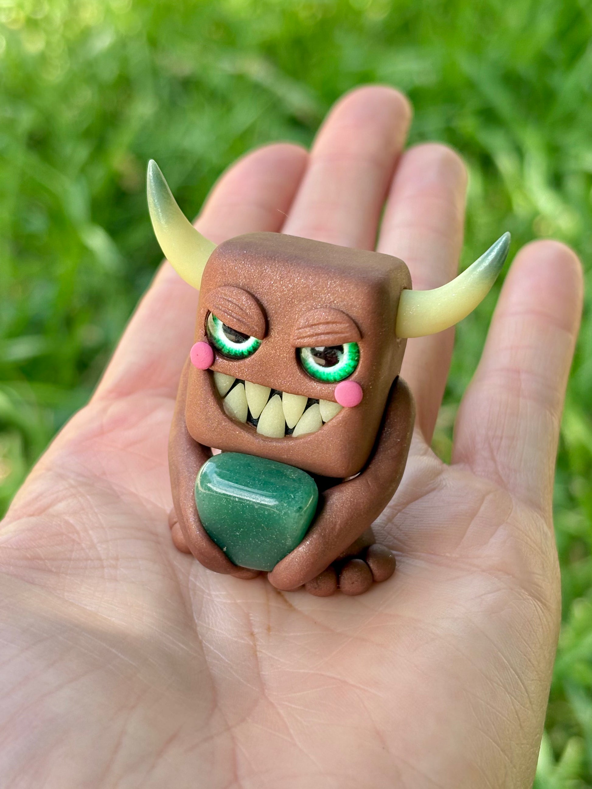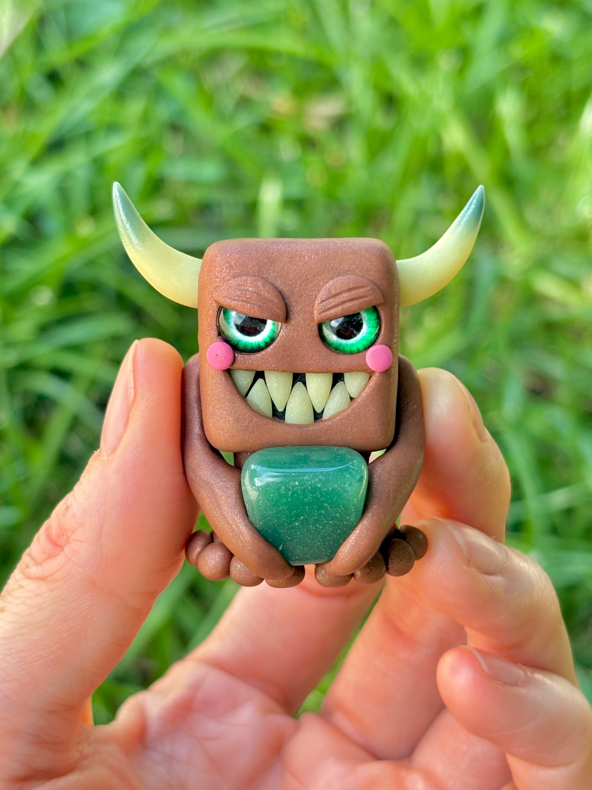 This handmade polymer clay Gem-lin figurine is holding a beautiful chunk of Aventurine.