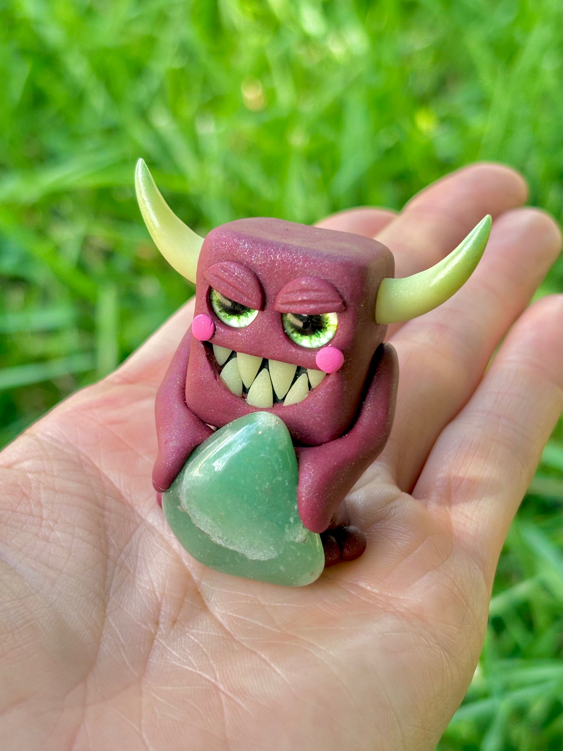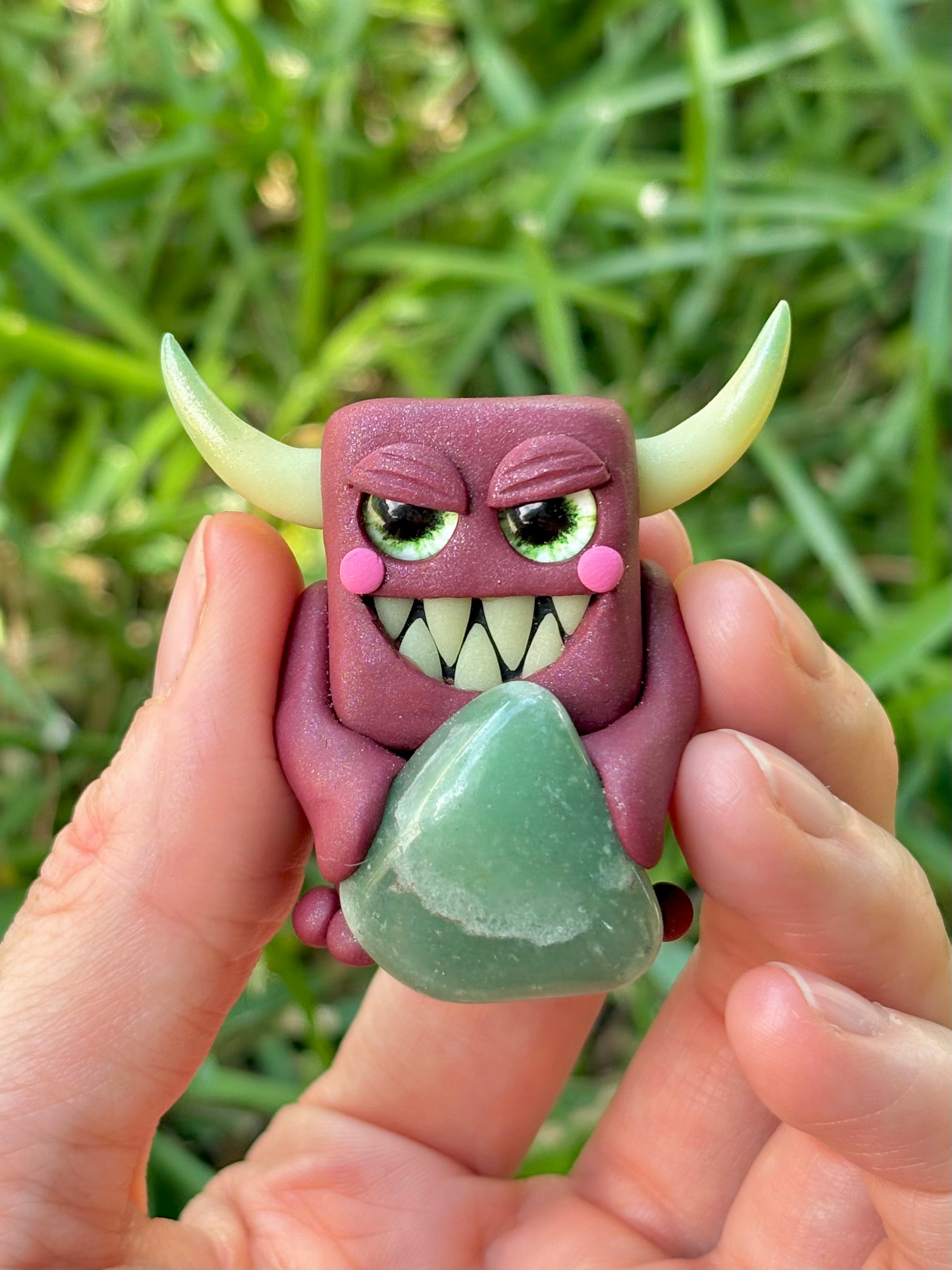 This handmade polymer clay Gem-lin figurine is holding a beautiful chunk of Aventurine.