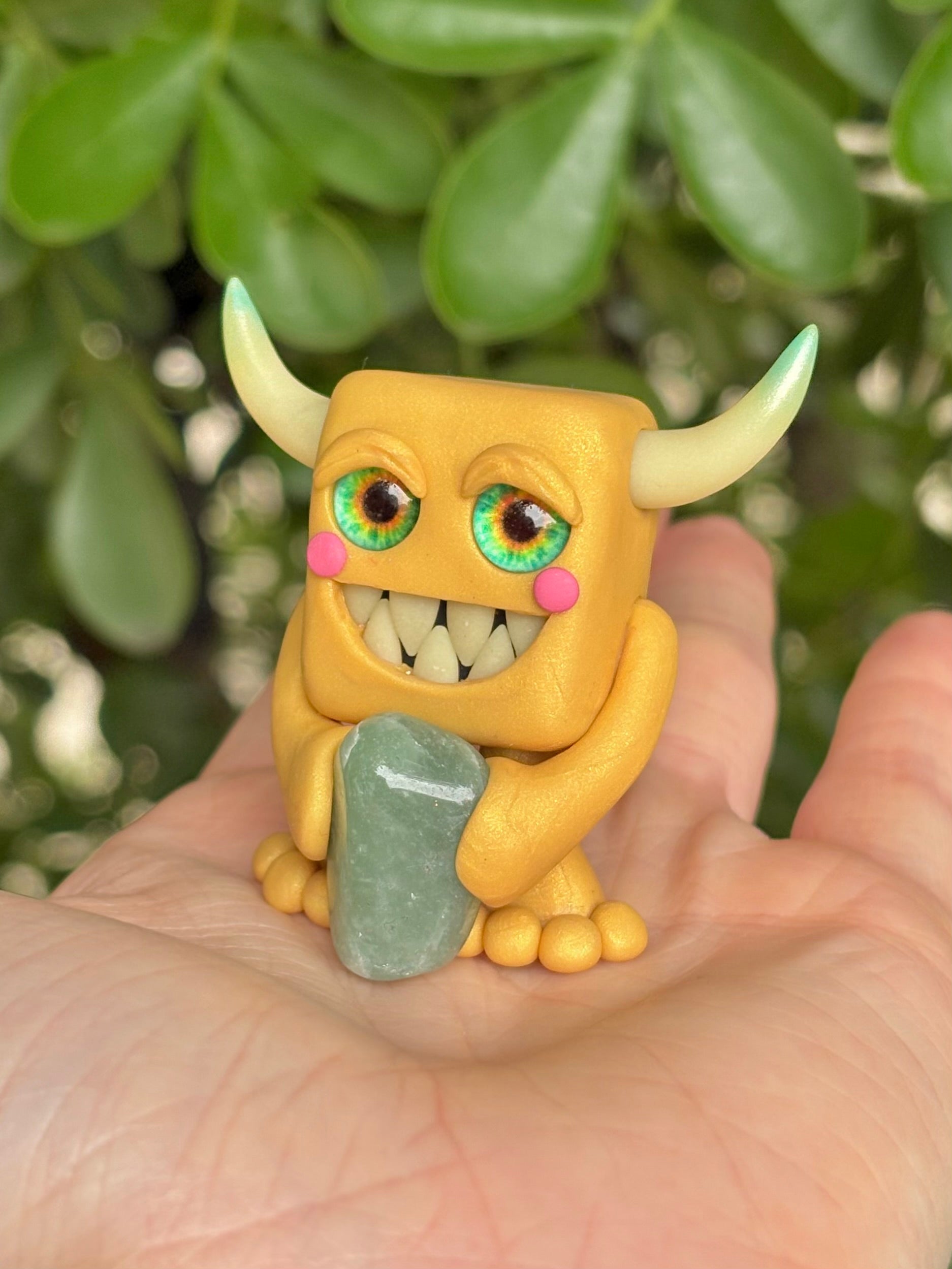 This handmade polymer clay Gem-lin figurine is holding a beautiful chunk of Aventurine.