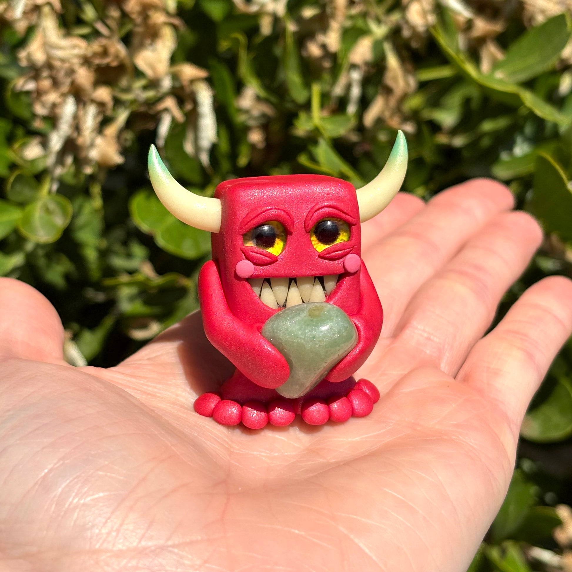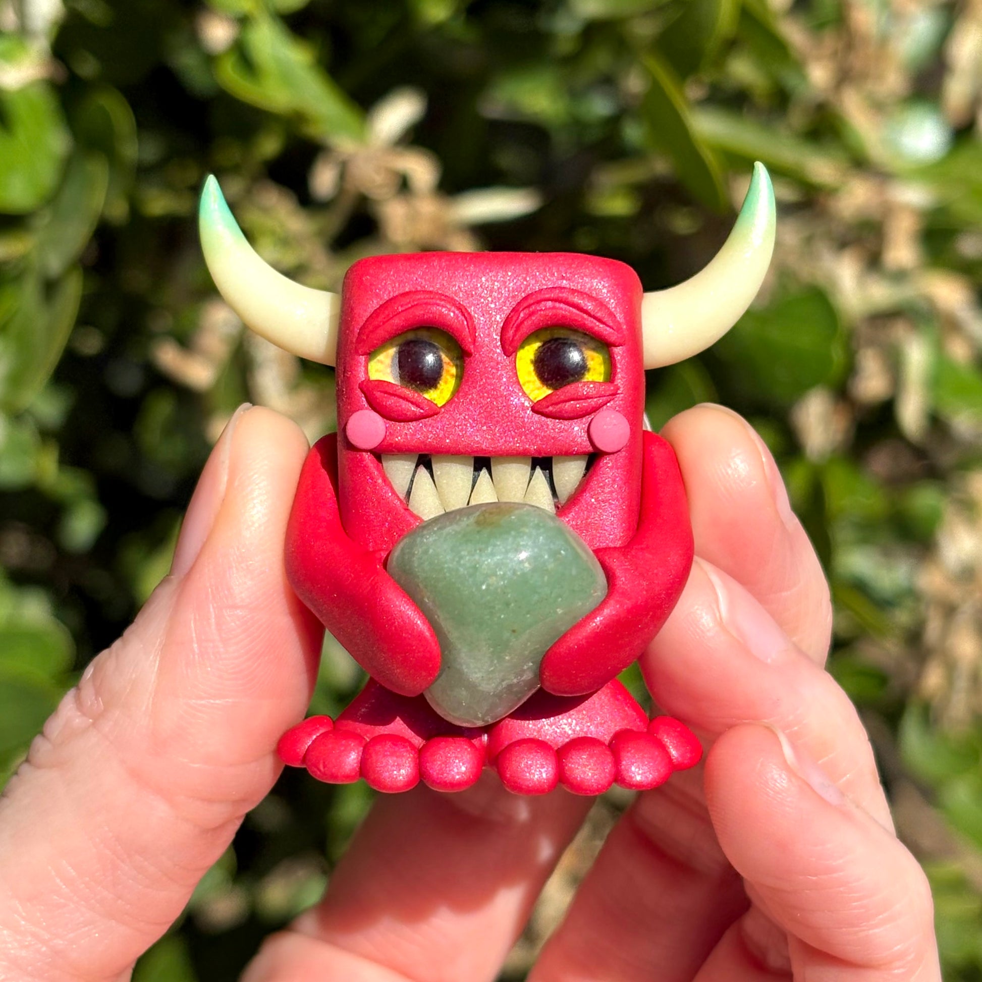 This handmade polymer clay Gem-lin figurine is holding a beautiful chunk of tumbled Aventurine.
