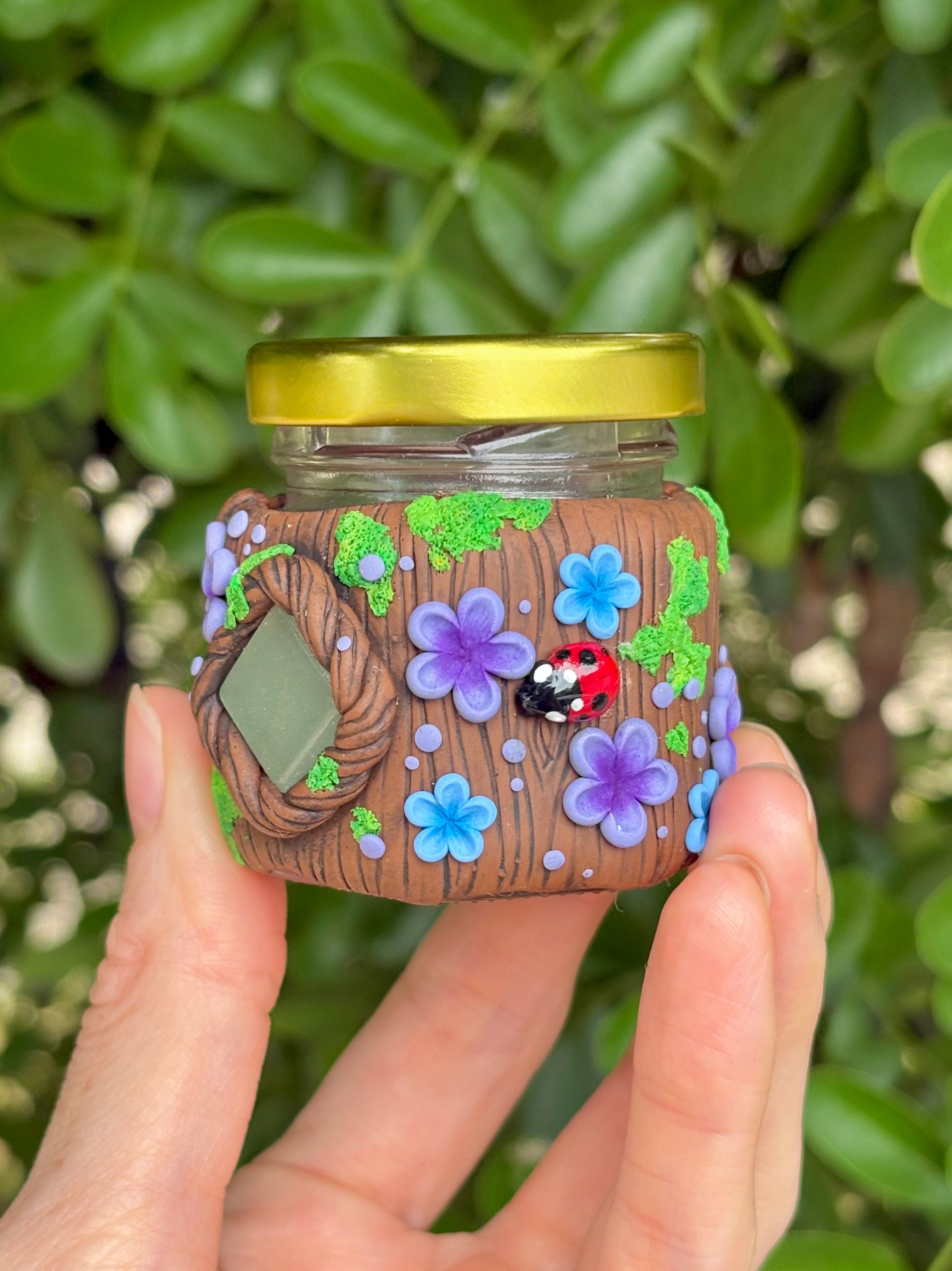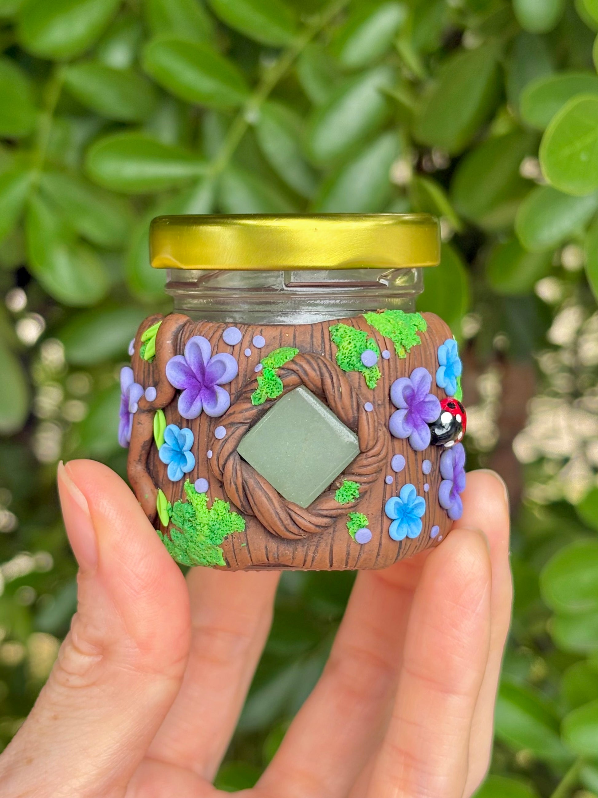 This woodland jar features aventurine, a gemstone believed to invite luck and growth. The stone is embedded among sculpted purple and blue blooms and lush green moss.