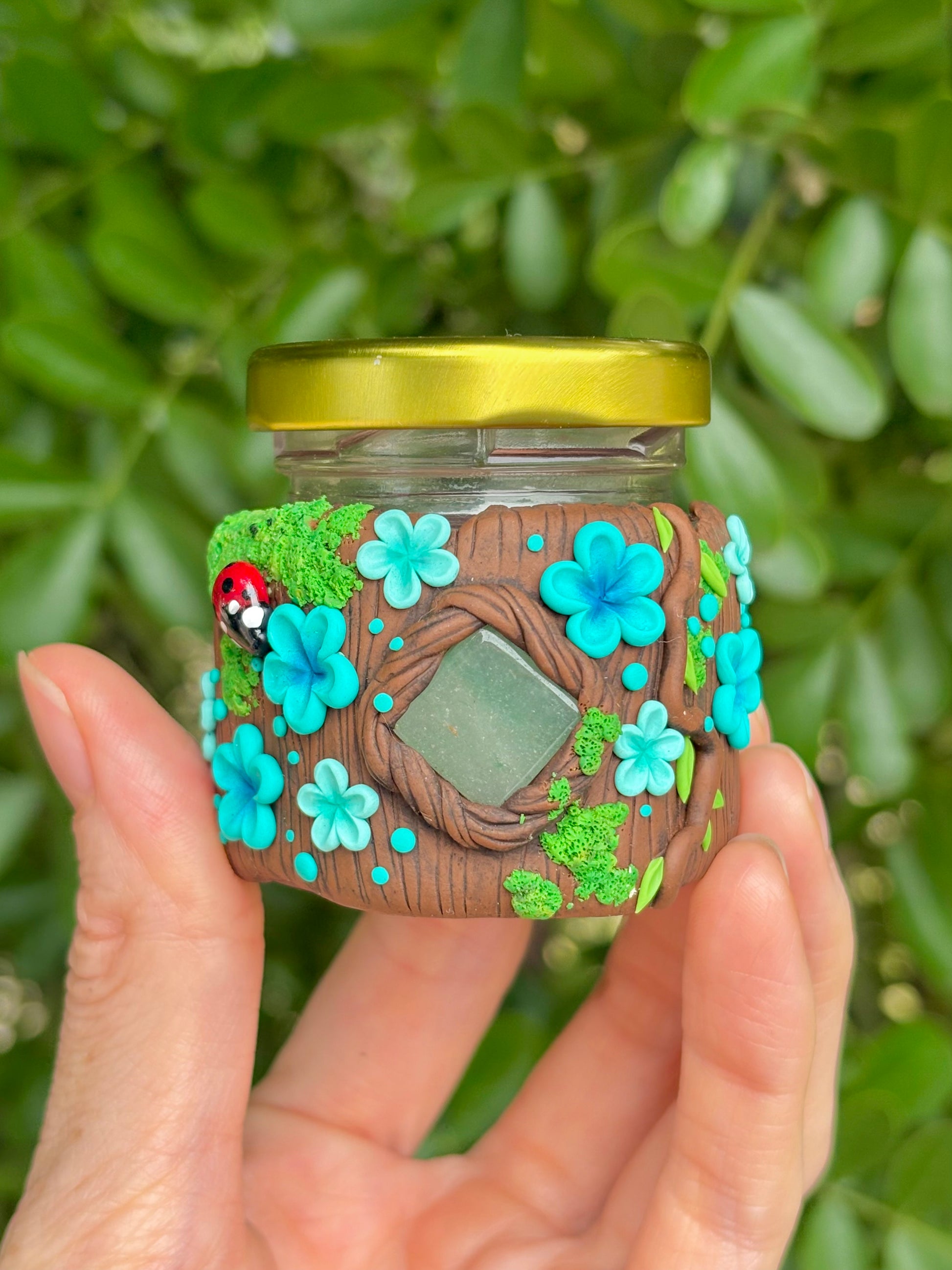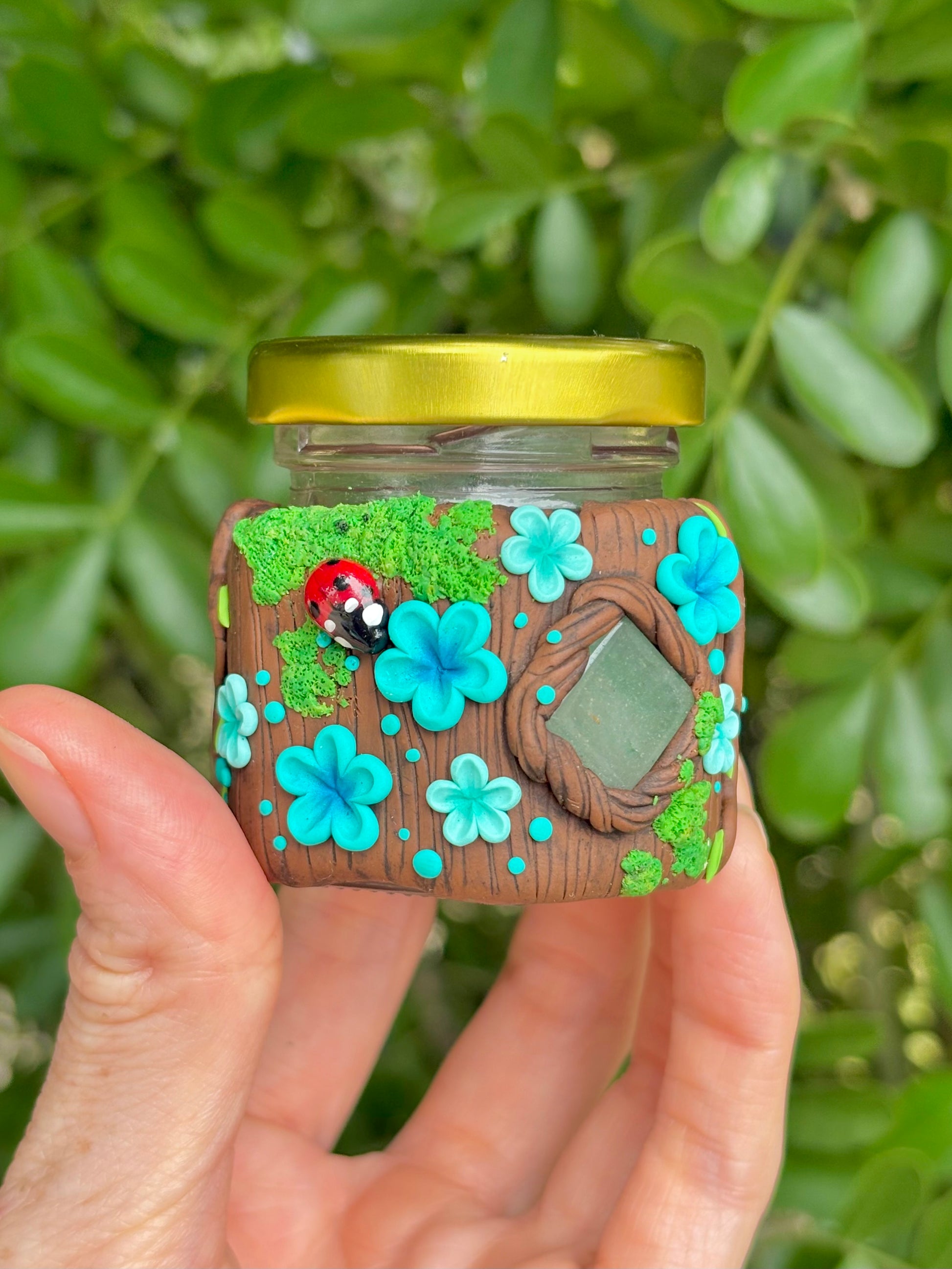 This woodland jar features aventurine, a gemstone believed to invite luck and growth. The stone is embedded among hand sculpted turquoise blooms and lush green moss.