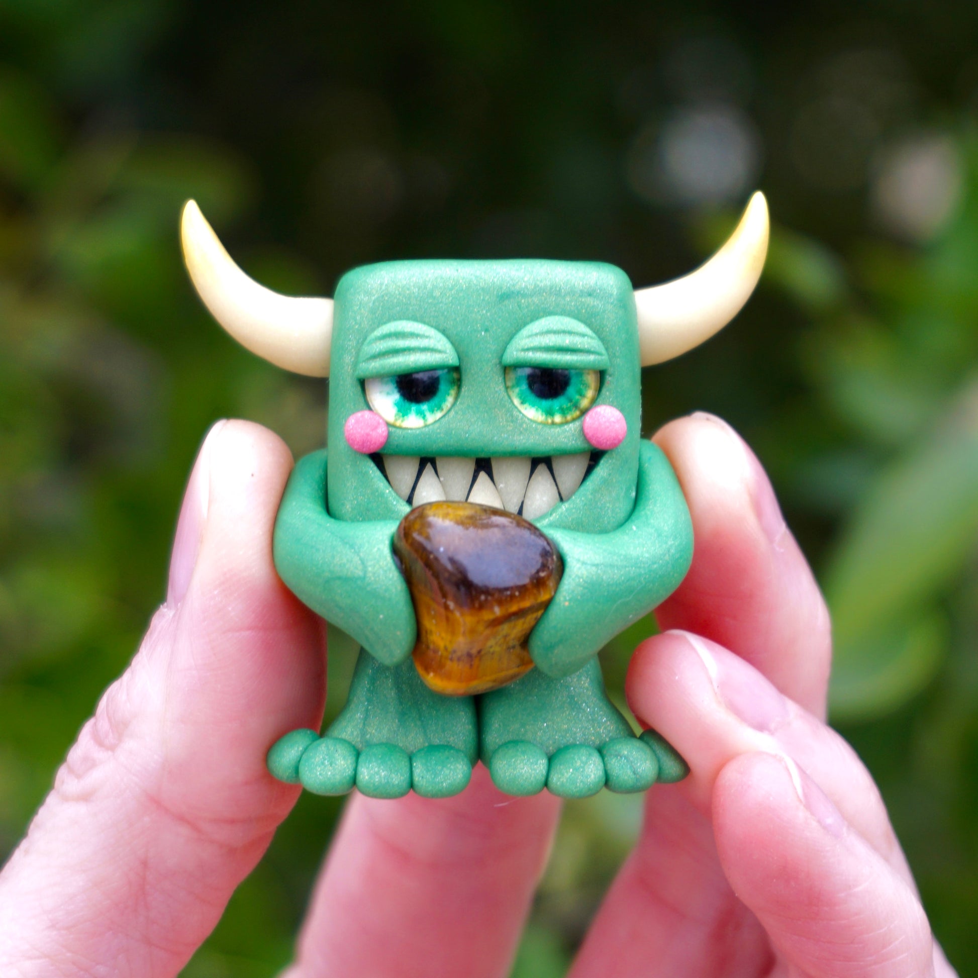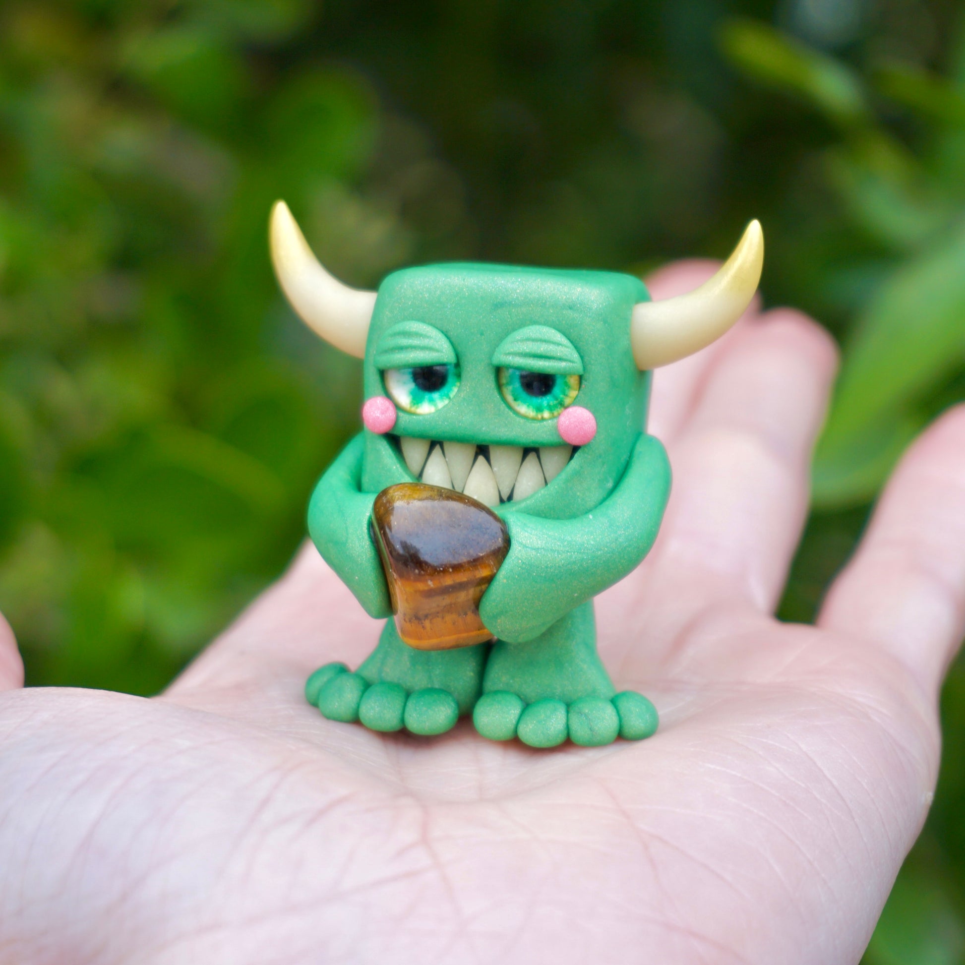 This handmade polymer clay Gem-lin figurine is holding a beautiful chunk of tumbled Tiger's eye.