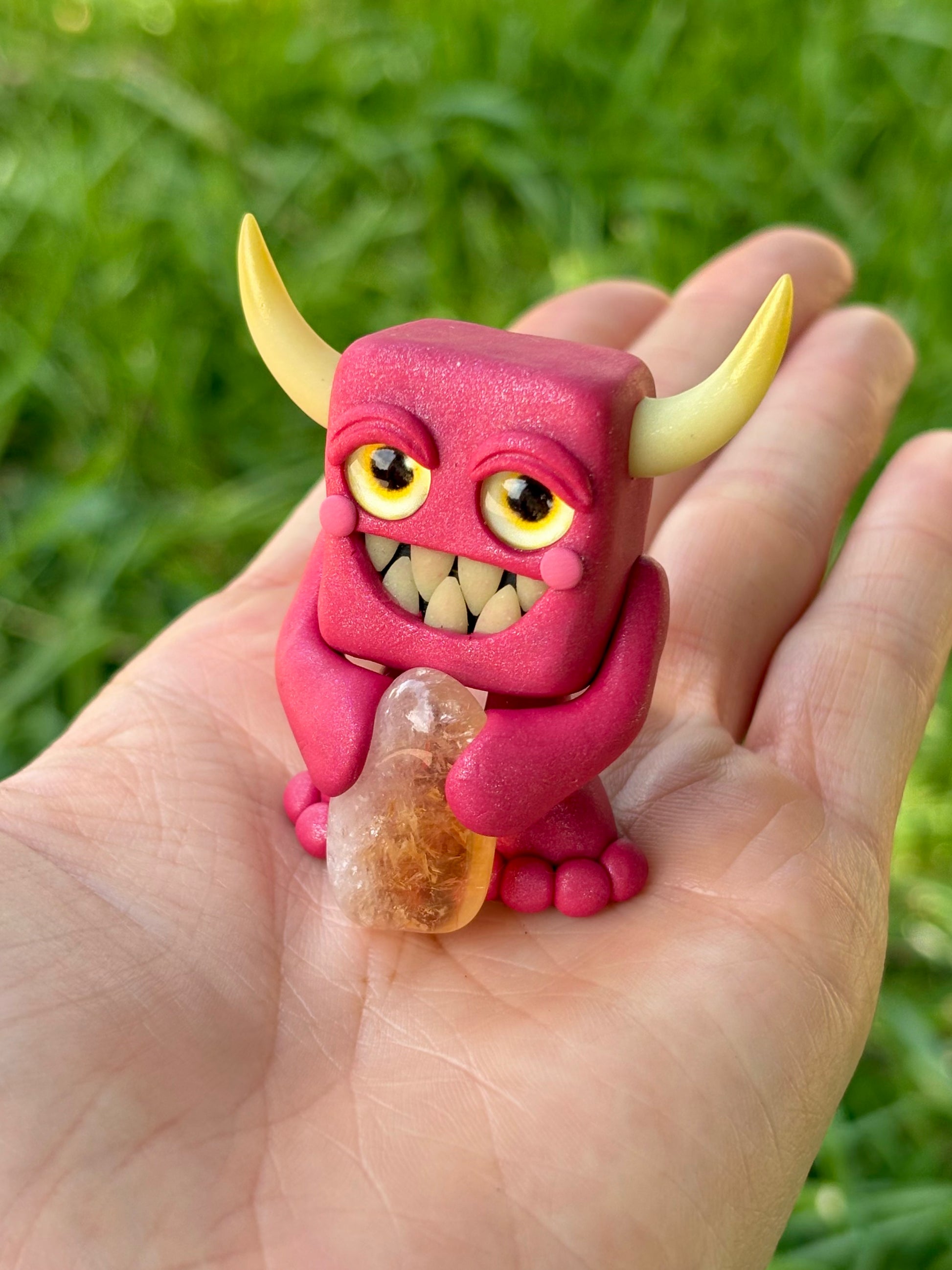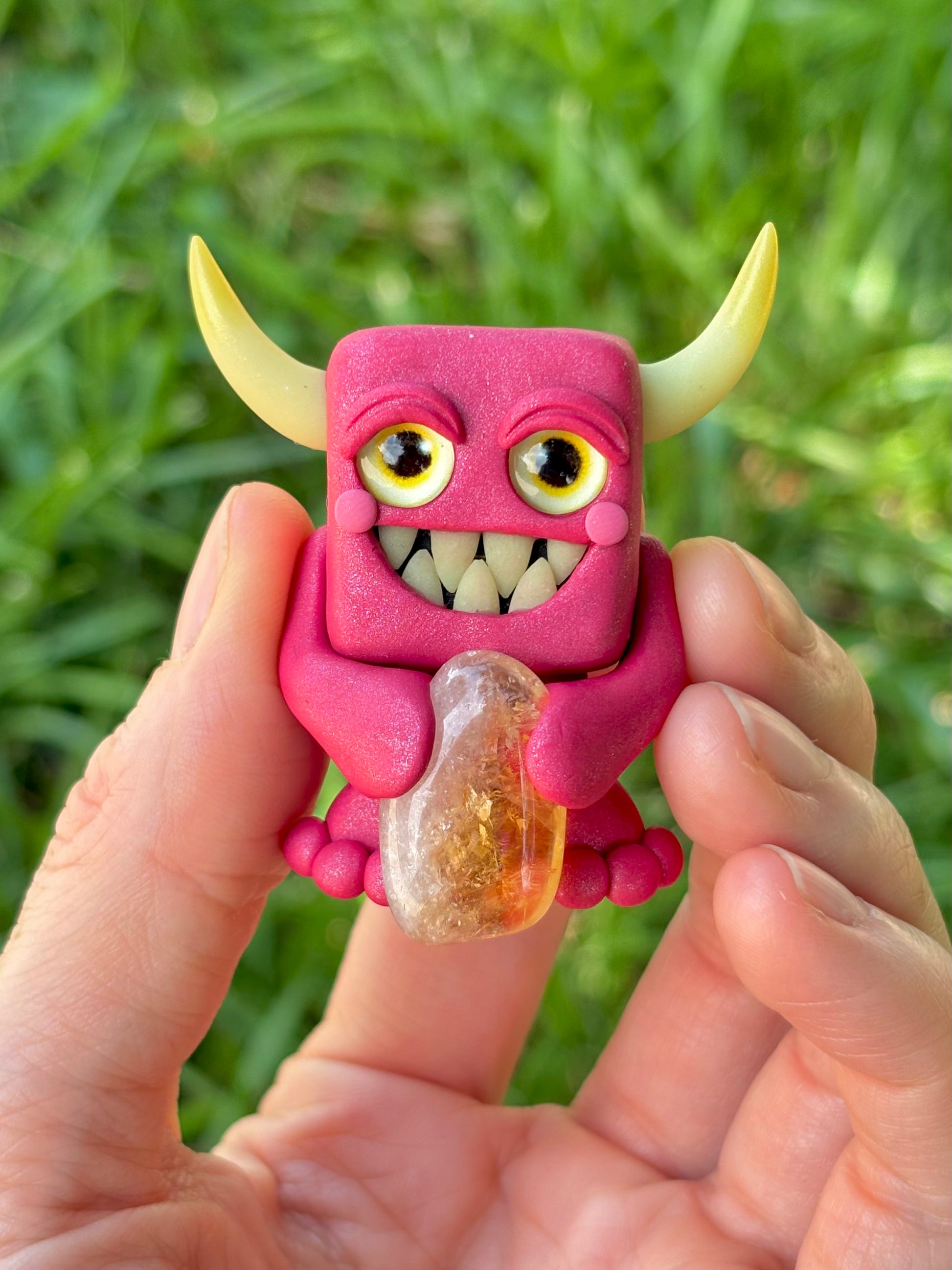 This handmade polymer clay Gem-lin figurine is holding a beautiful chunk of Citrine.