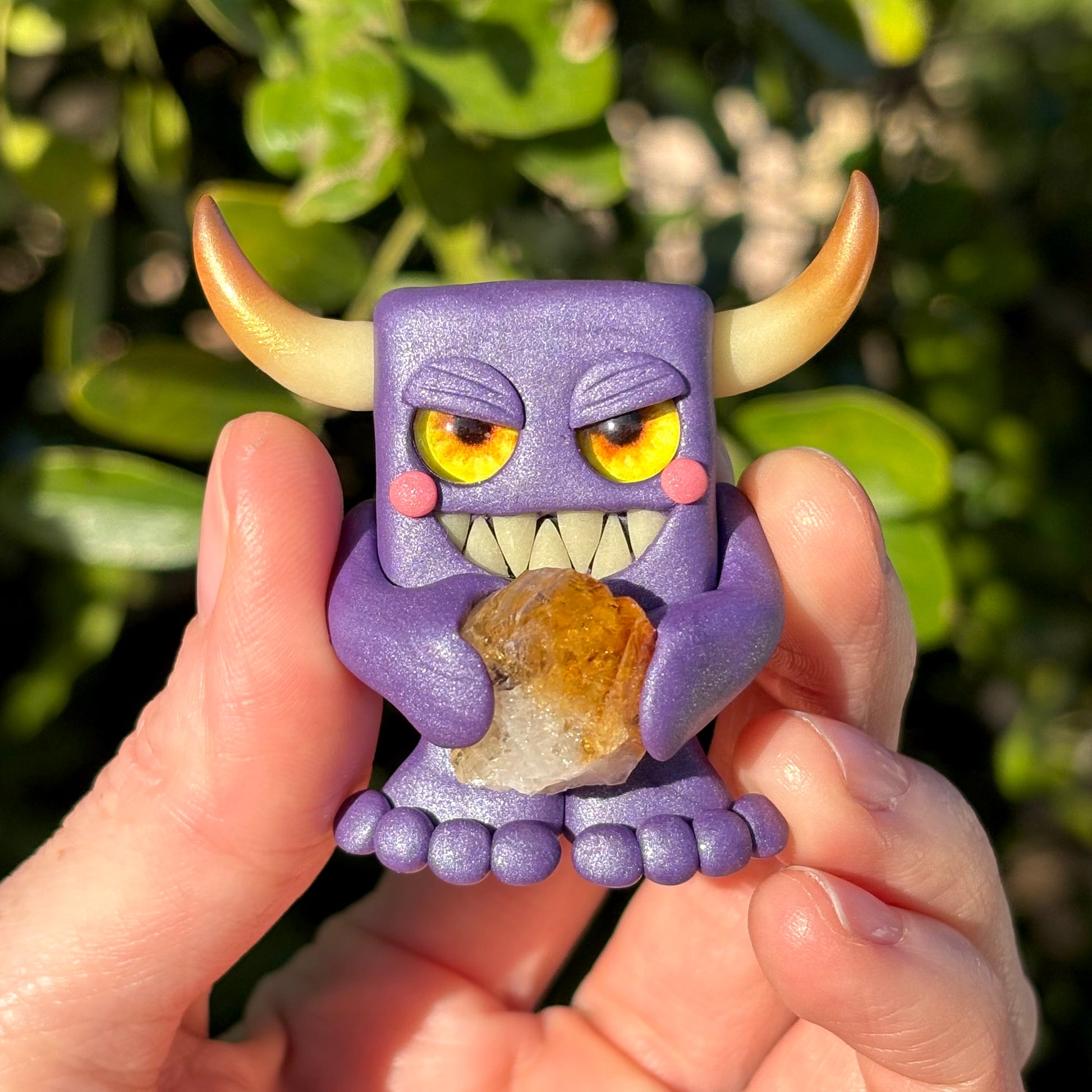 This handmade polymer clay Gem-lin figurine is holding a beautiful piece of Citrine.