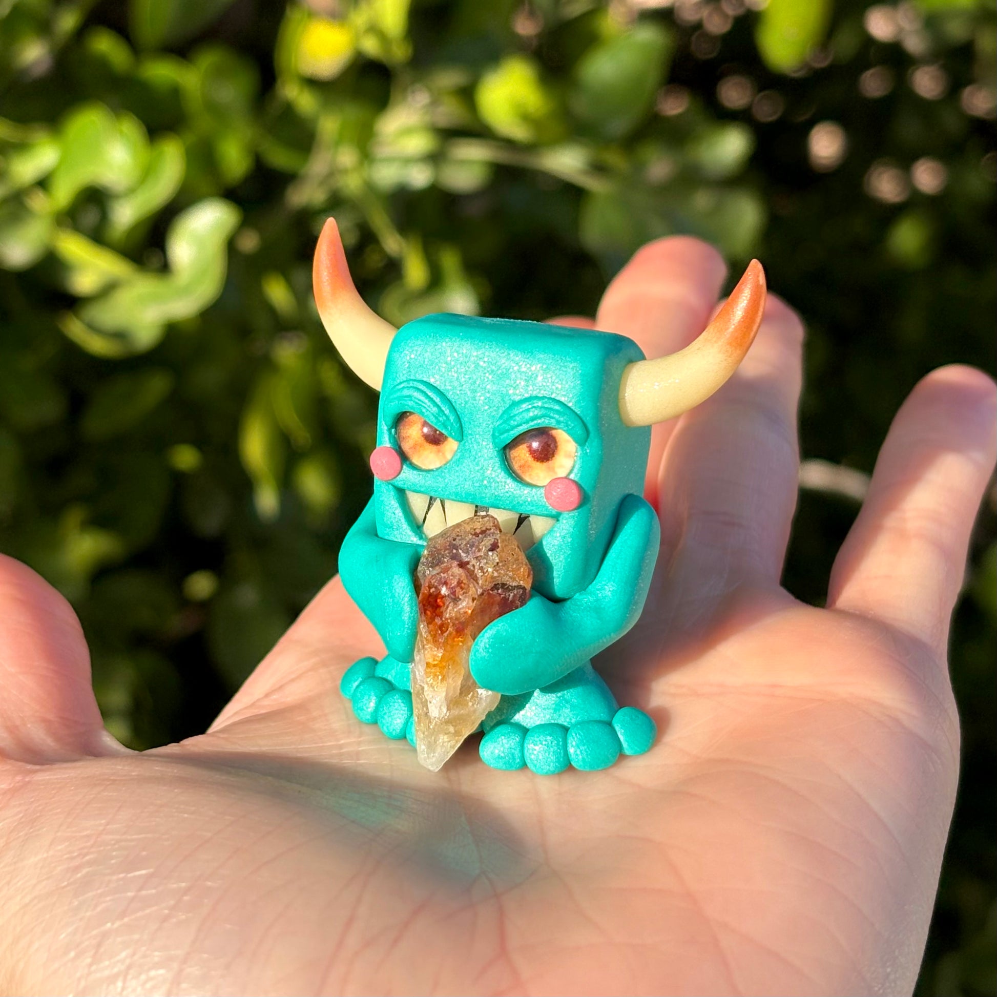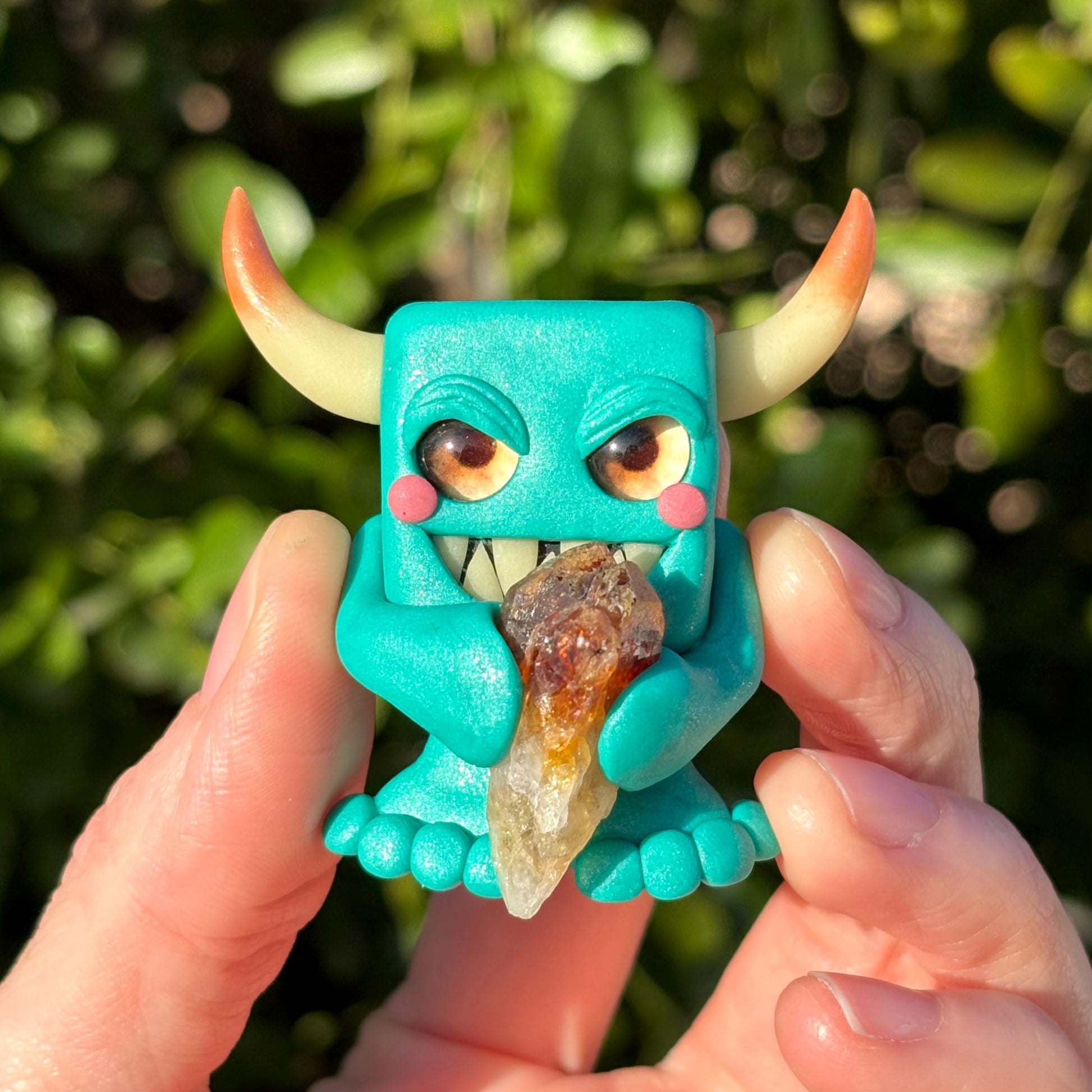 This handmade polymer clay Gem-lin figurine is holding a beautiful Citrine point.