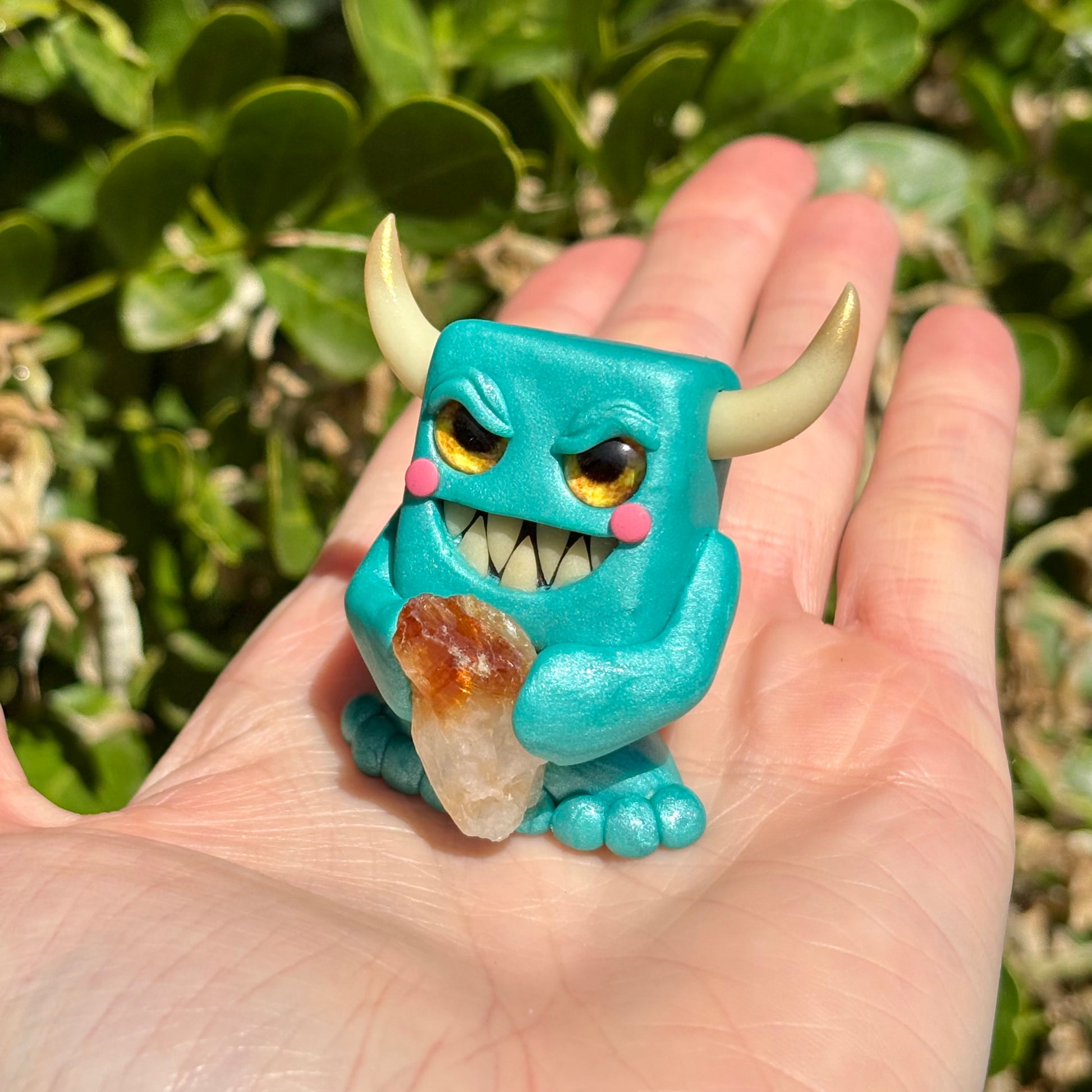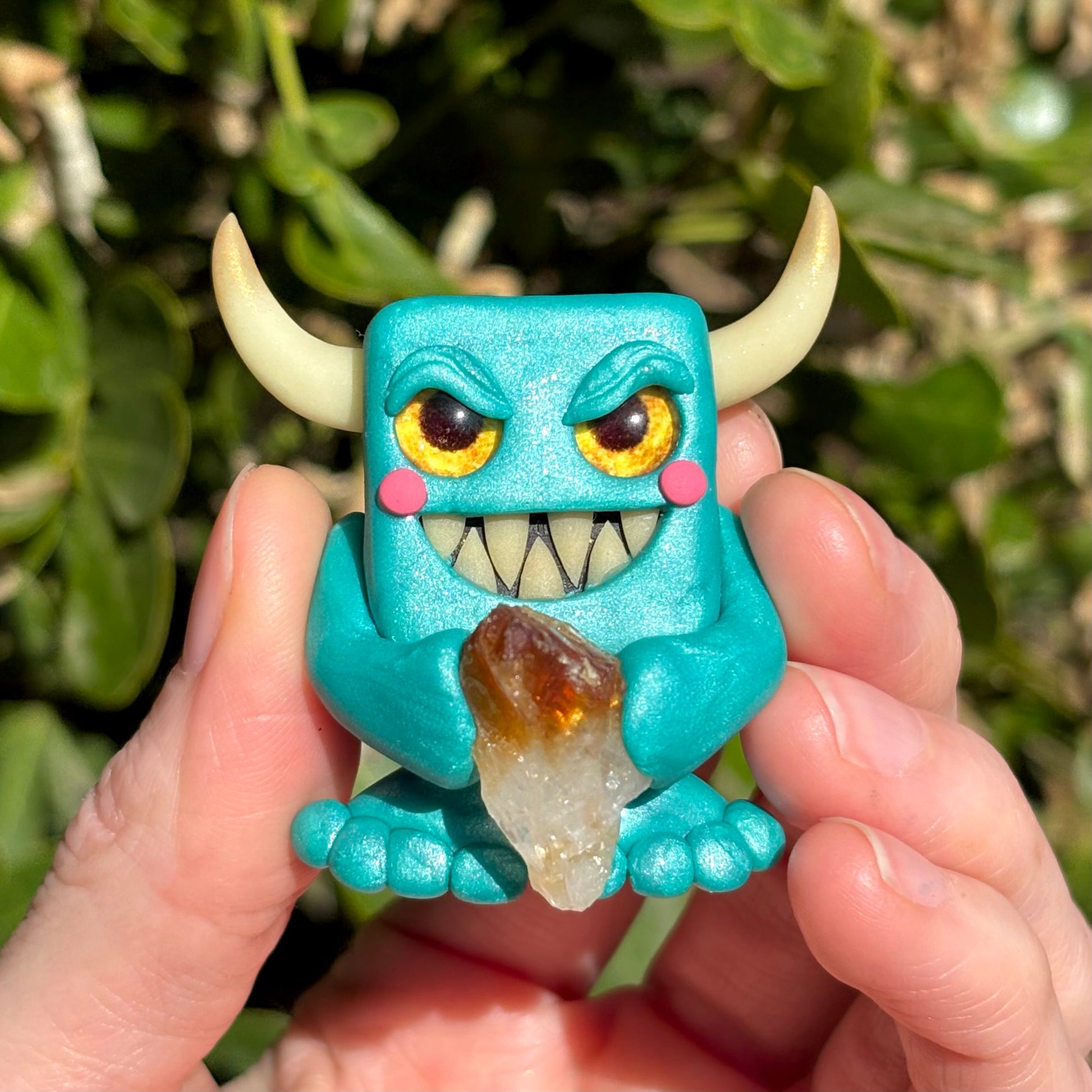 This handmade polymer clay Gem-lin figurine is holding a beautiful Citrine point.