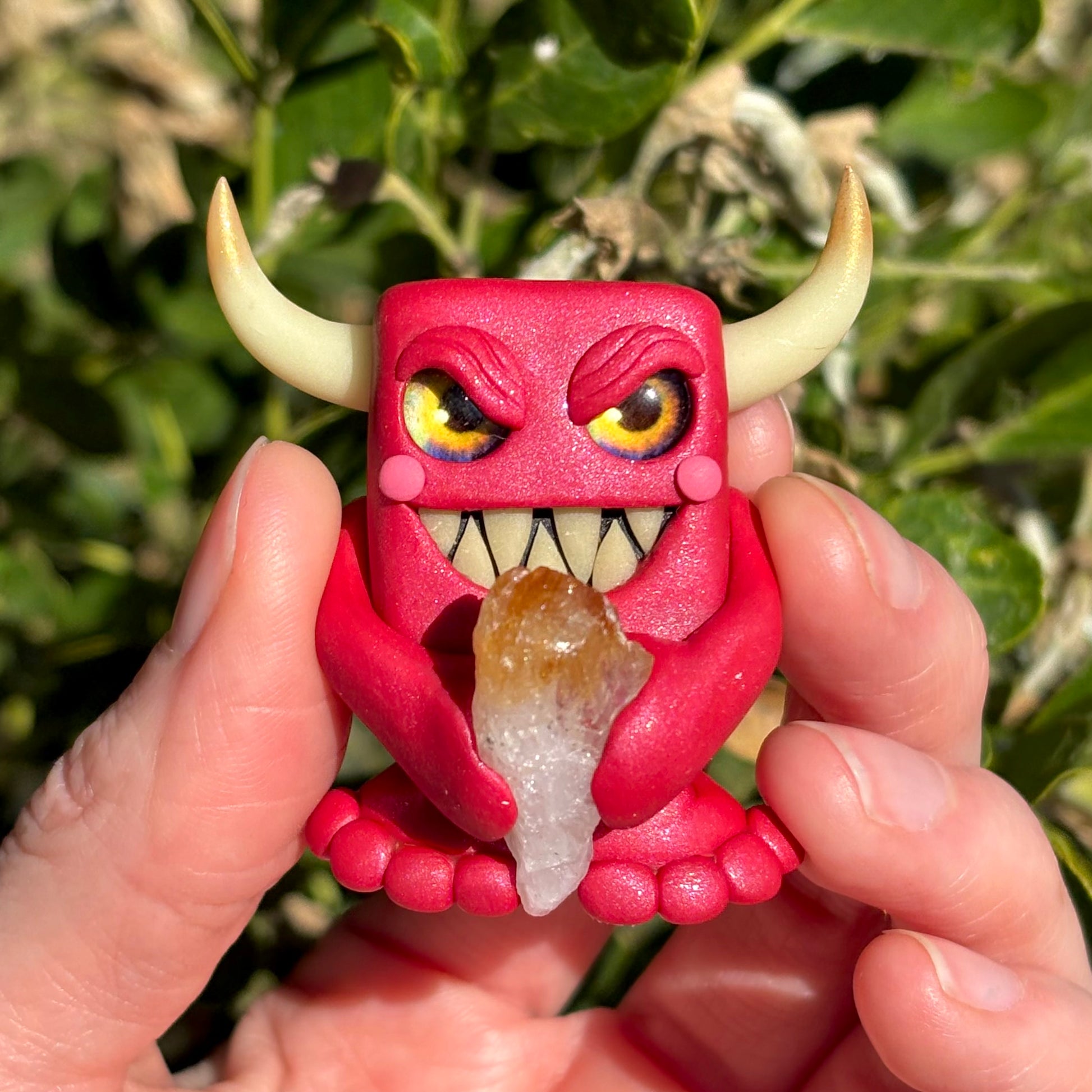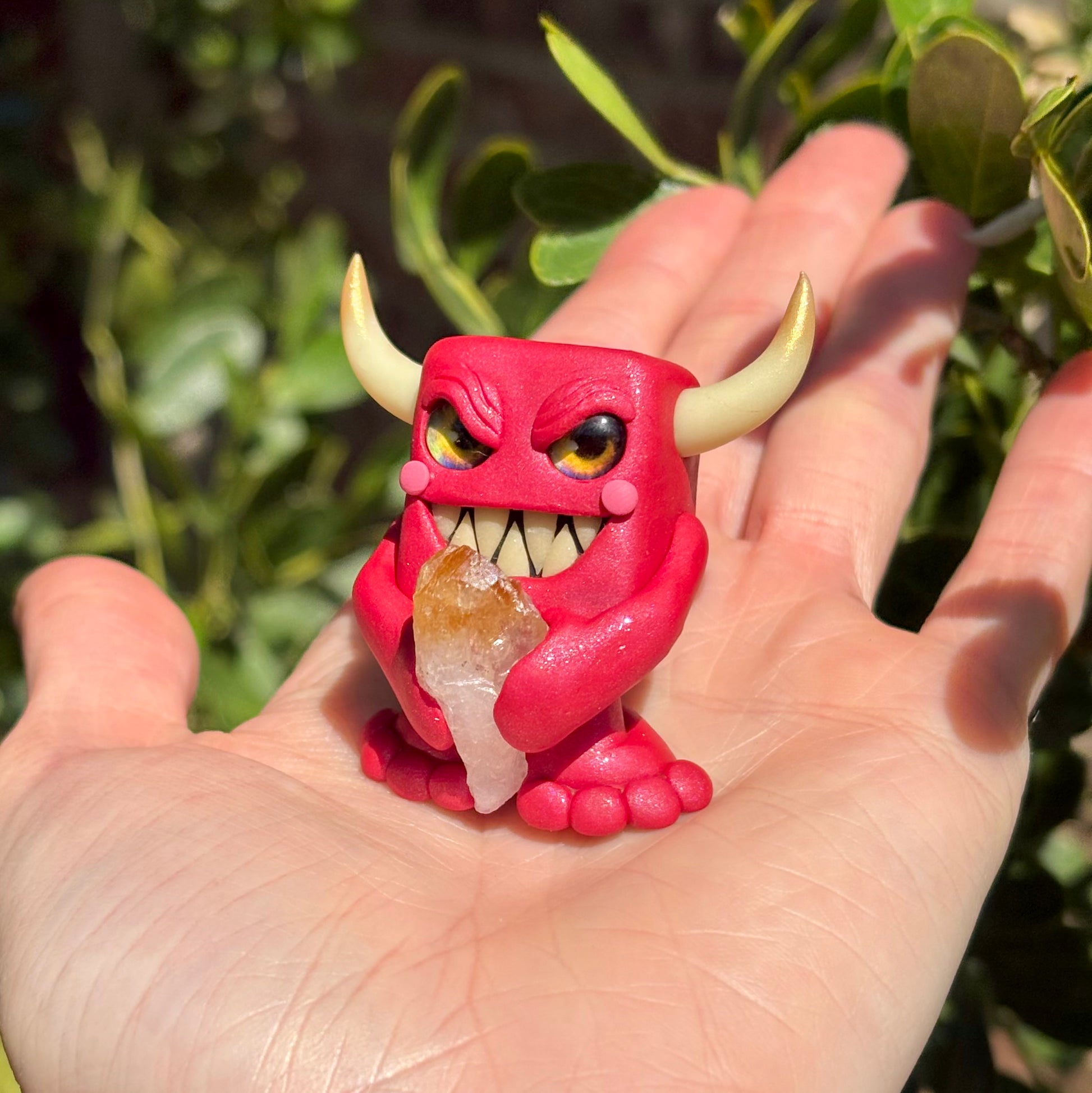 This handmade polymer clay Gem-lin figurine is holding a beautiful chunk of raw Citrine.