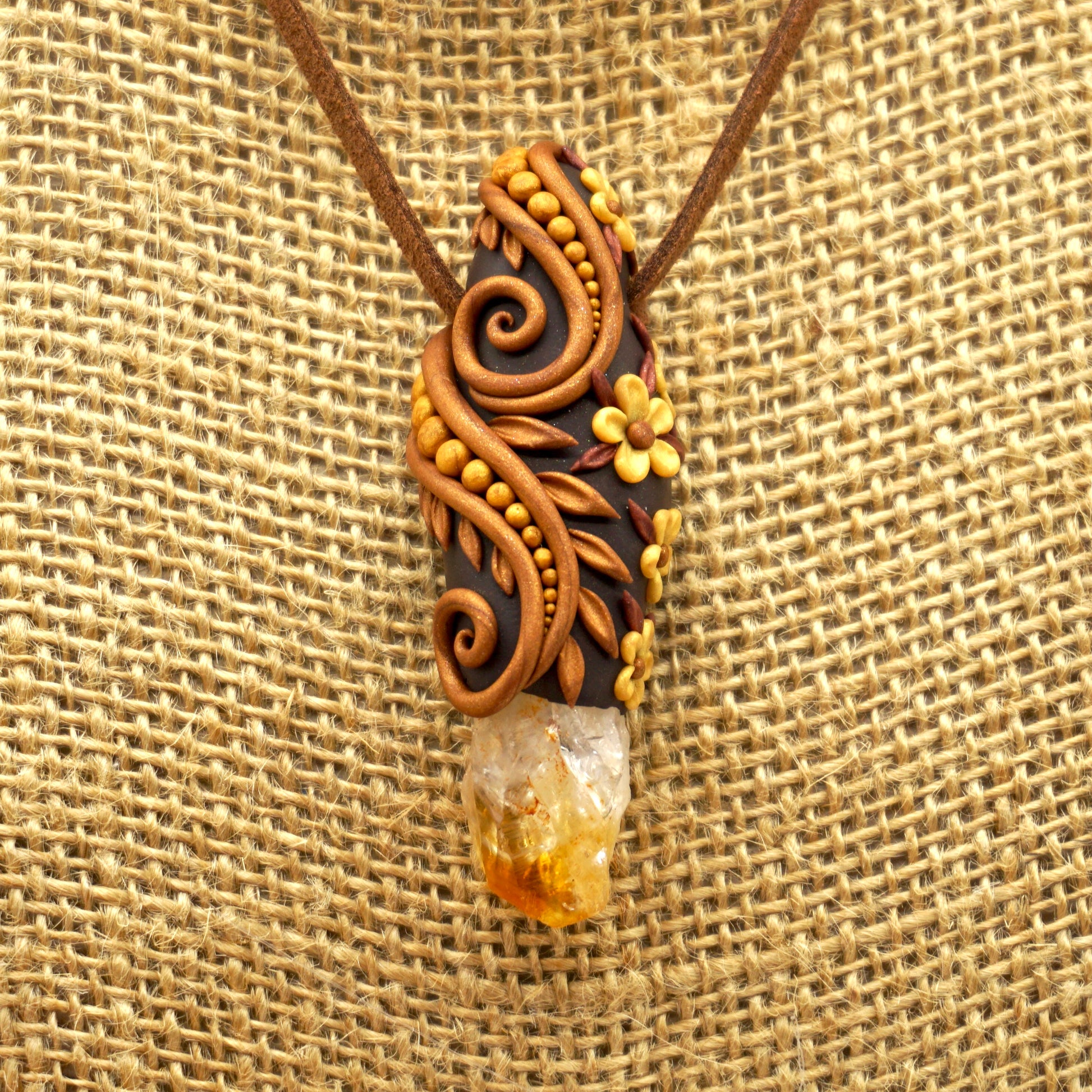 Citrine wrapped in polymer clay. Comes with suede cord.