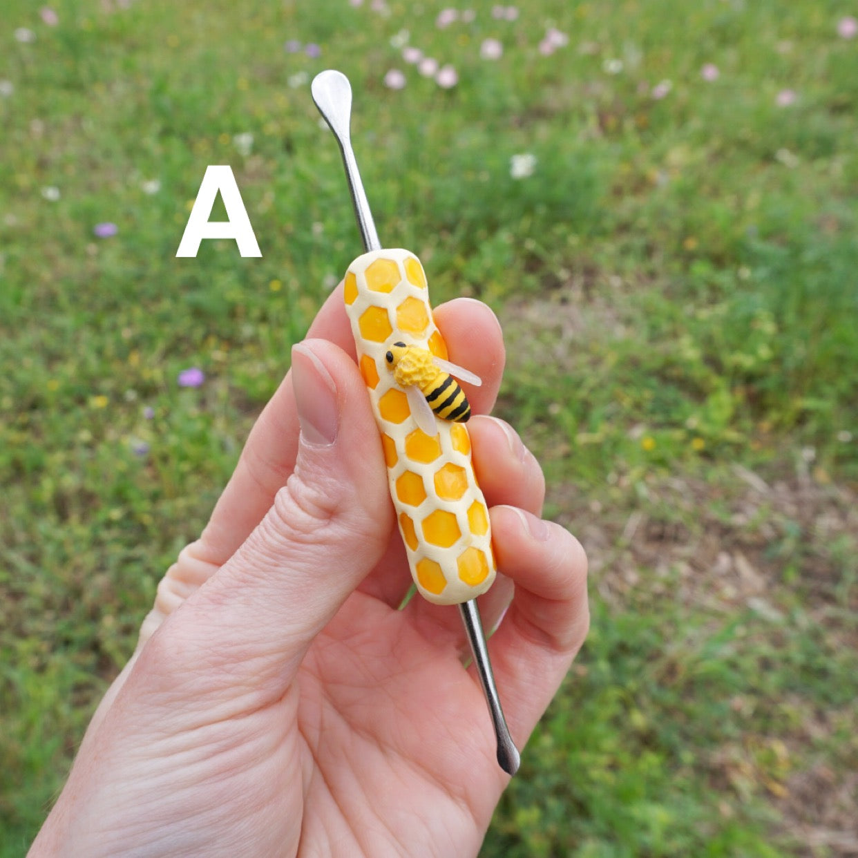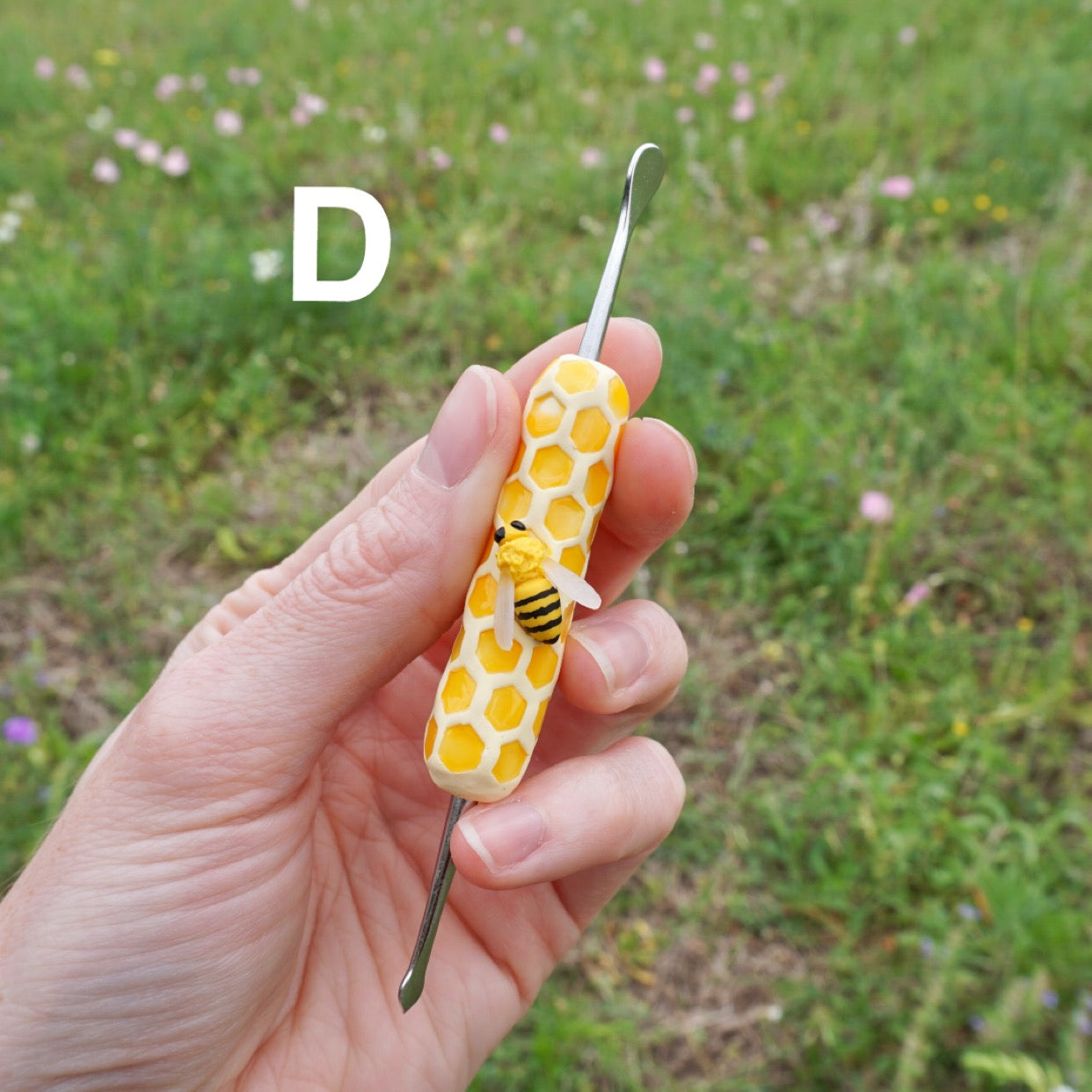 Handmade polymer clay honeycomb and bee sculpture on metal dab tools.