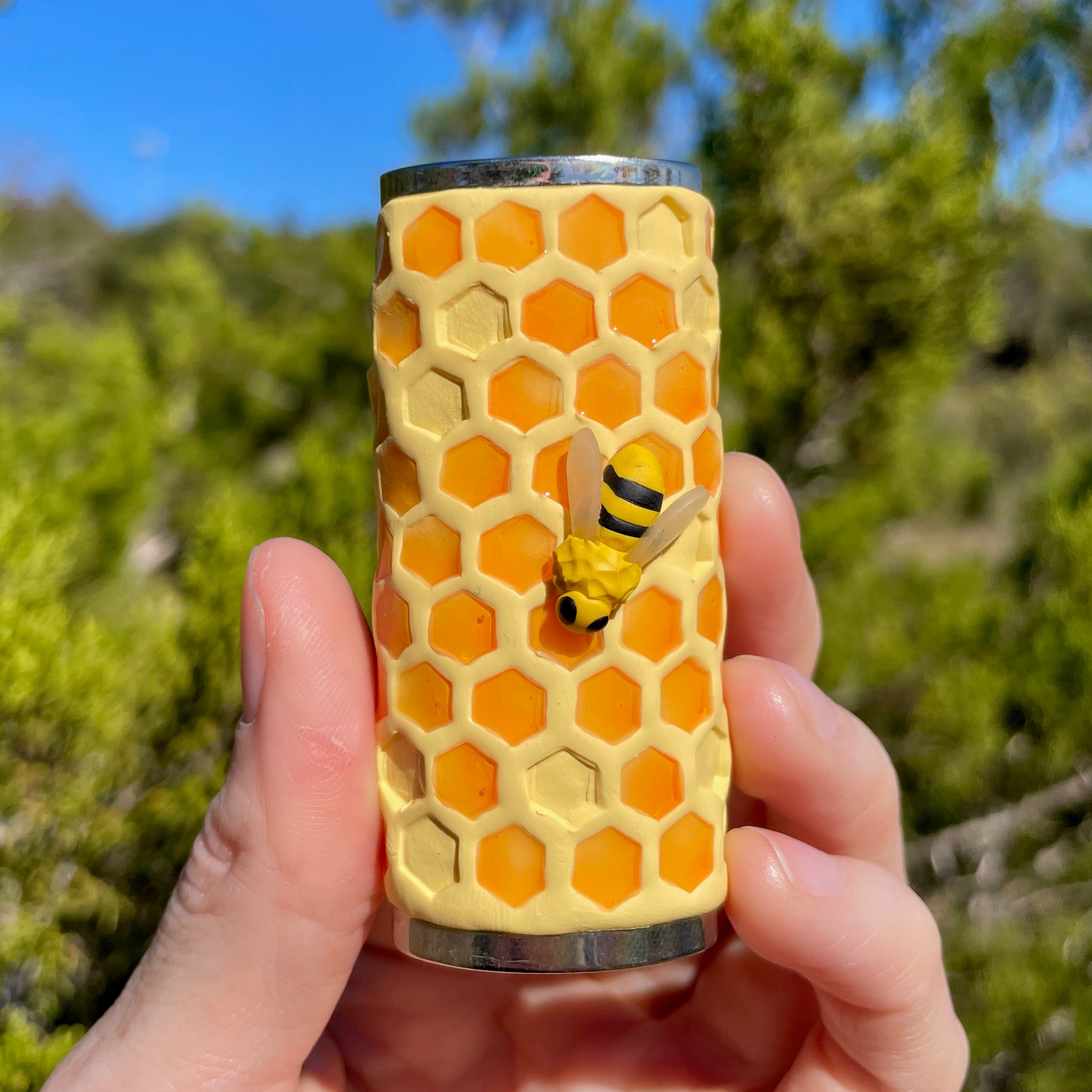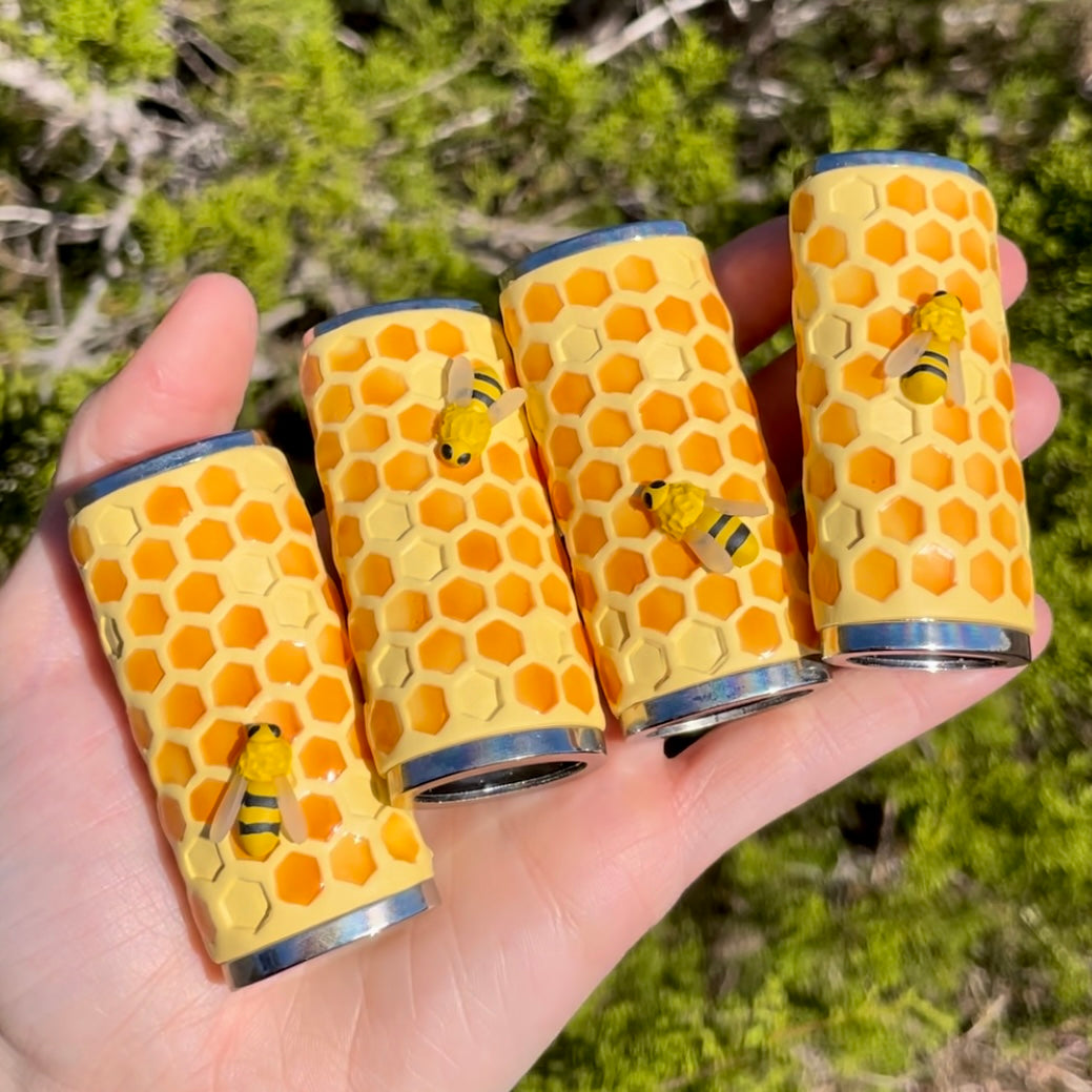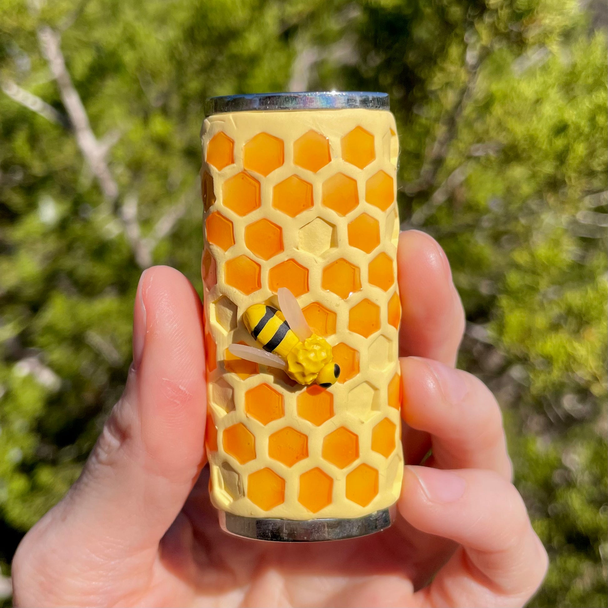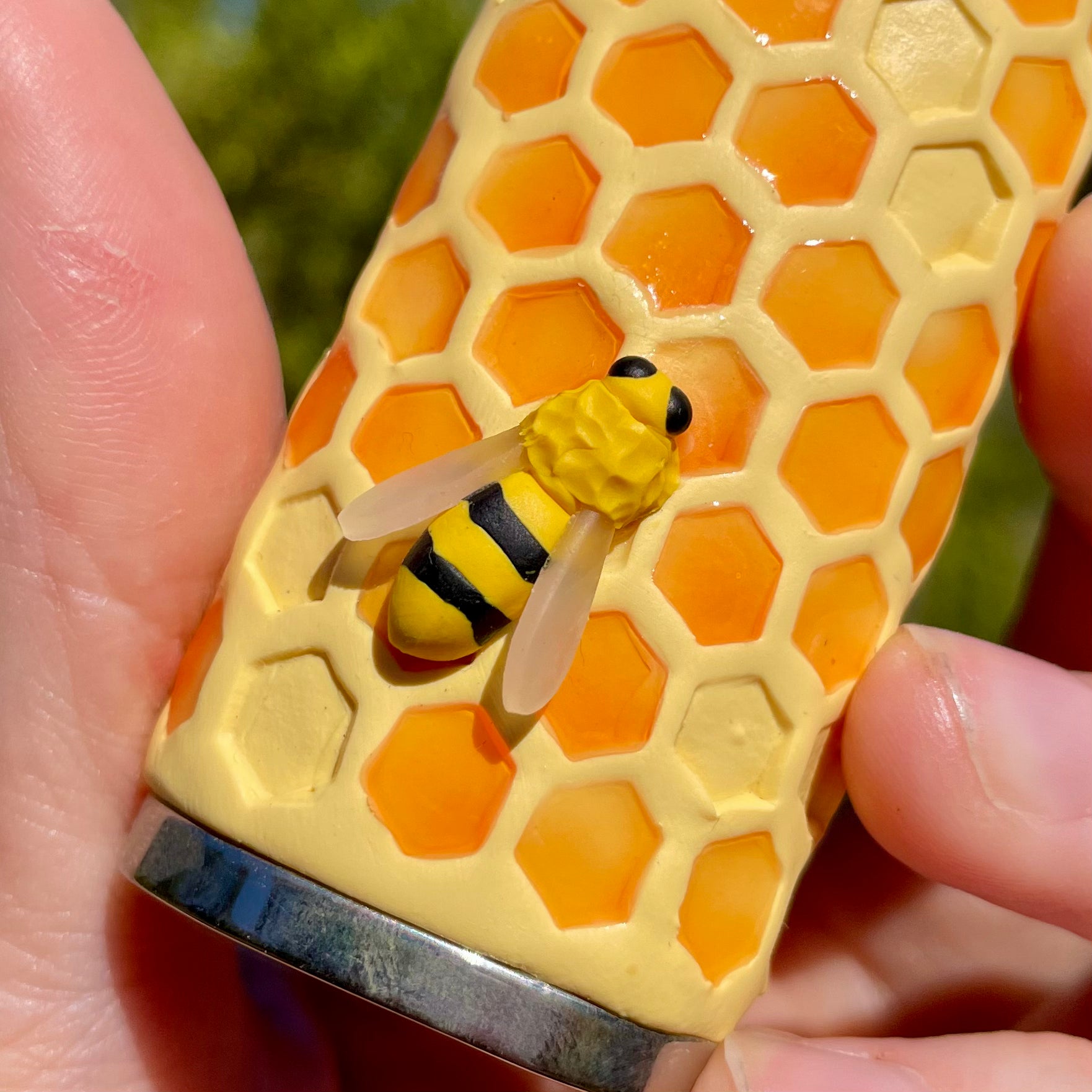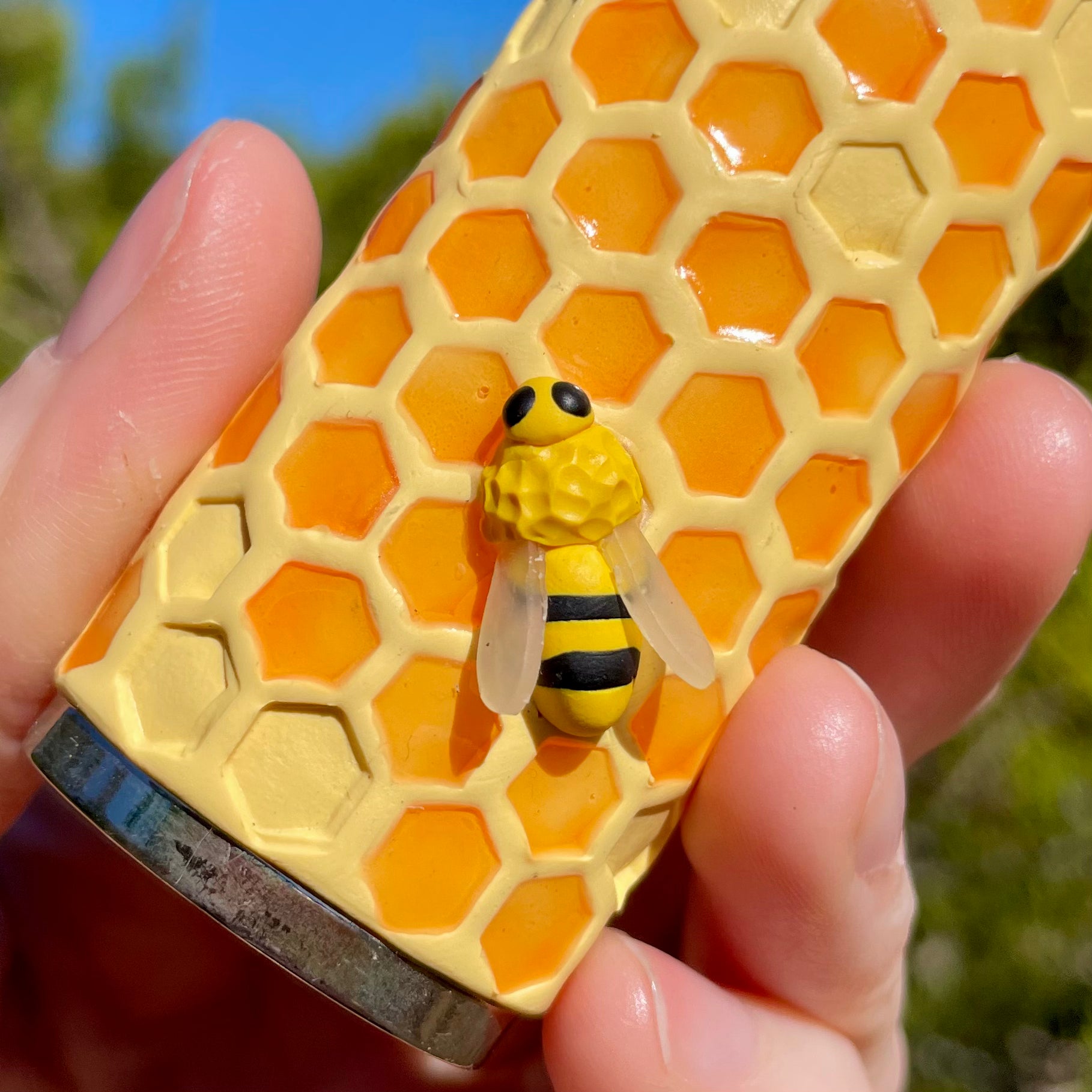 Handmade polymer clay honeycomb and bee sculptures on top of metal lighter covers.
