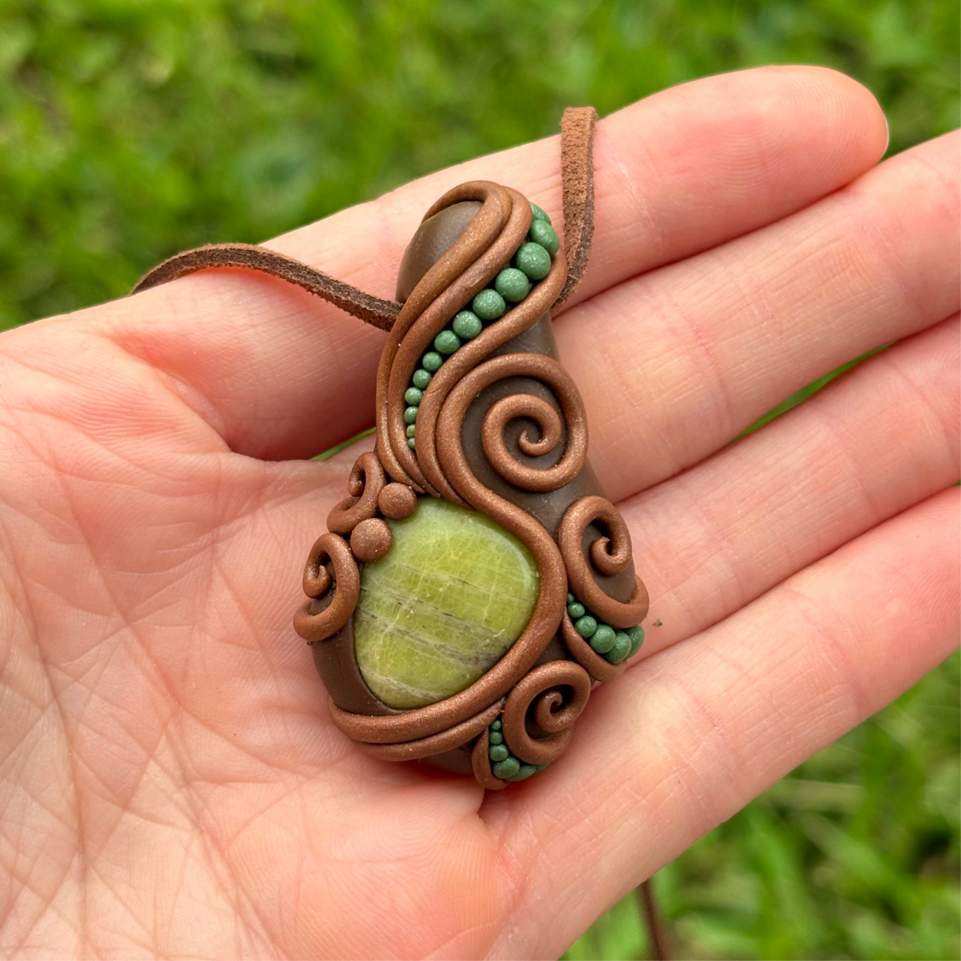Jade wrapped in polymer clay. Comes with suede cord.