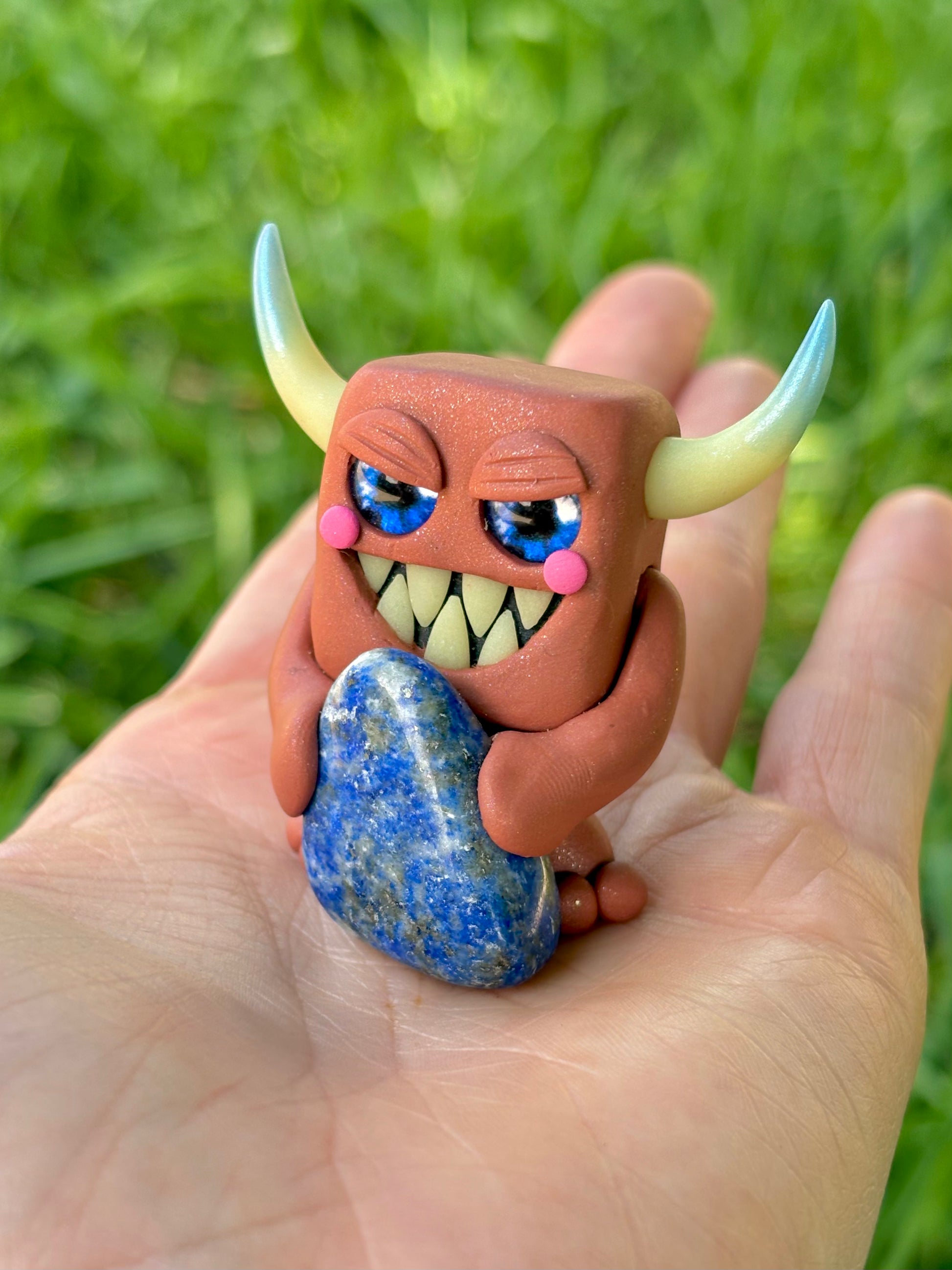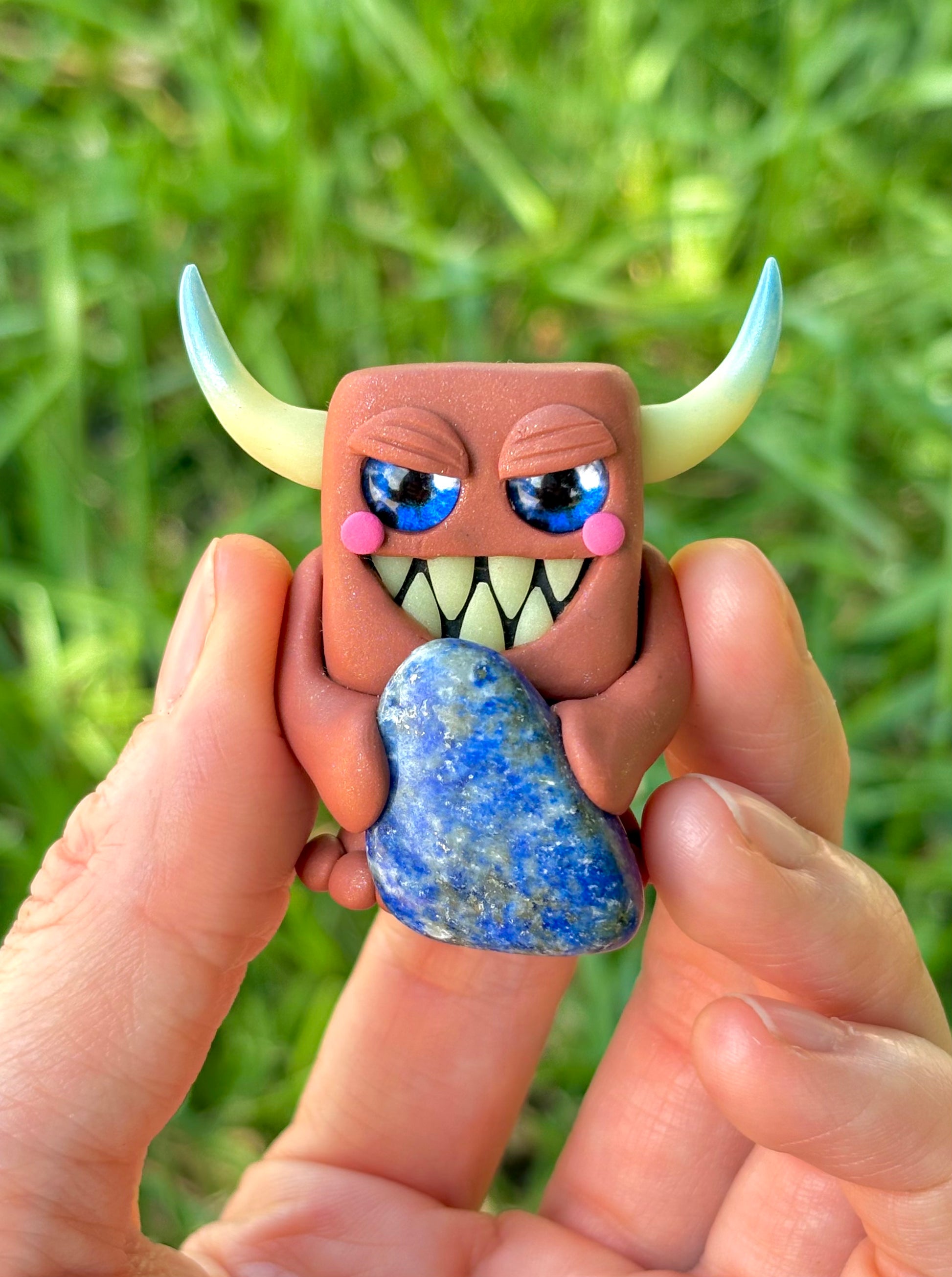 This handmade polymer clay Gem-lin figurine is holding a beautiful chunk of Lapis Lazuli.