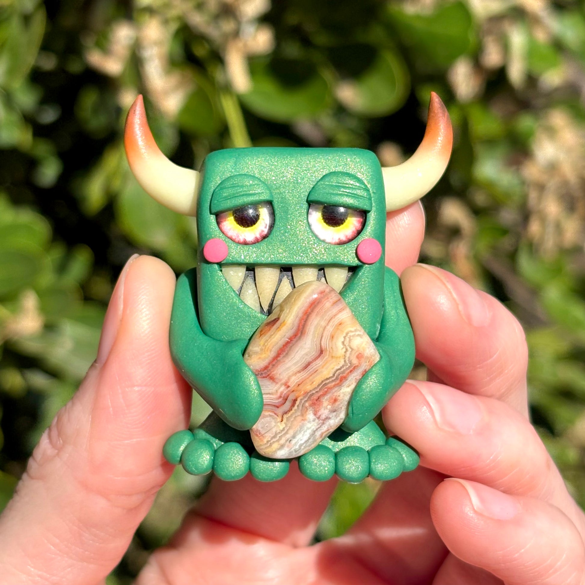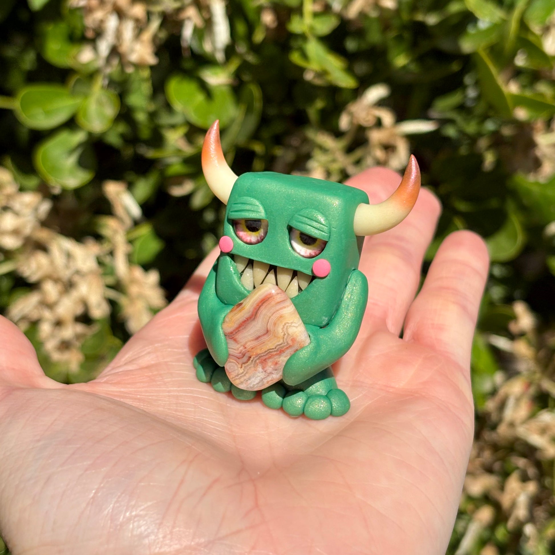 This handmade polymer clay Gem-lin figurine is holding a beautiful chunk of tumbled Mookaite Jasper.