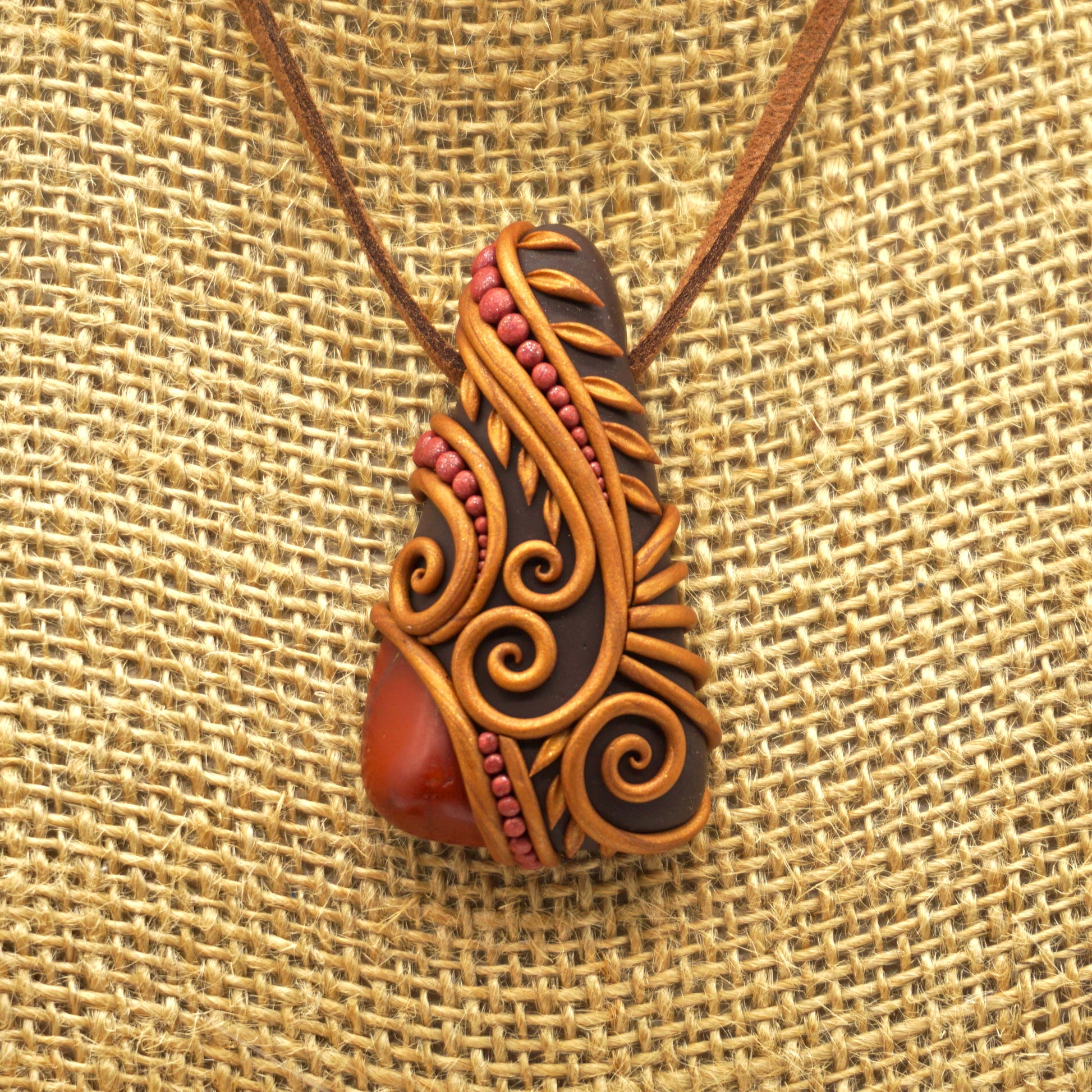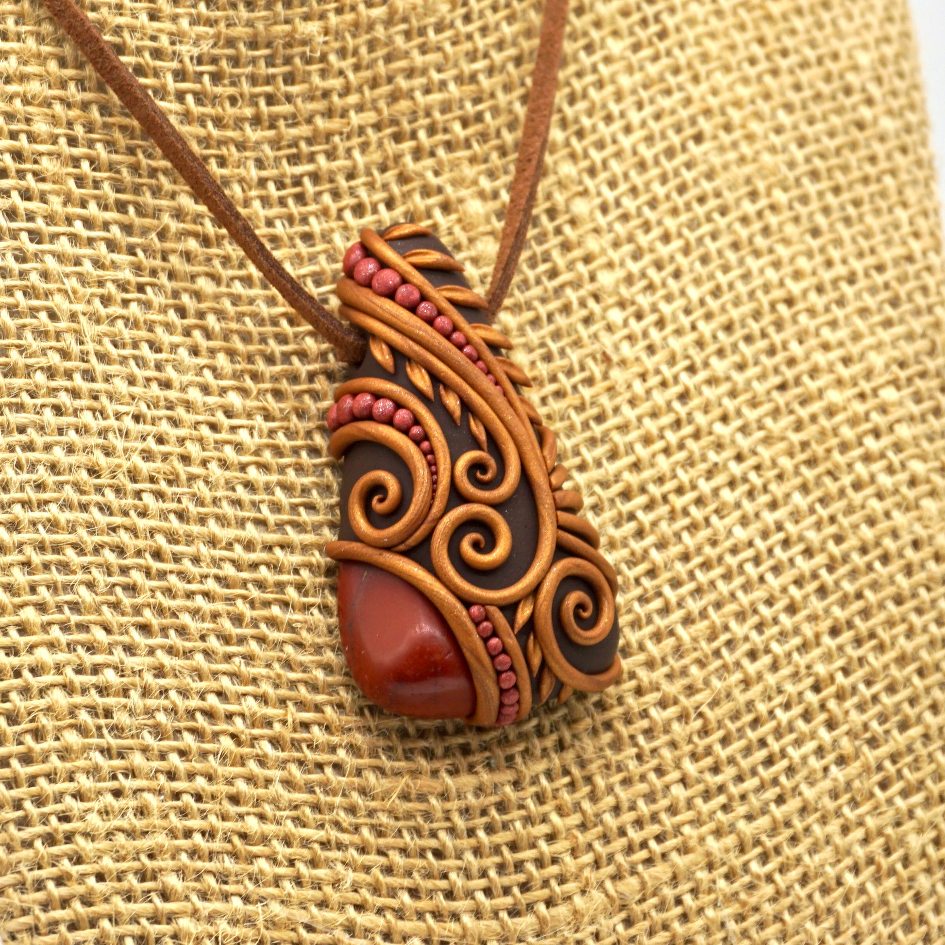 Mookaite wrapped in polymer clay. Comes with suede cord.