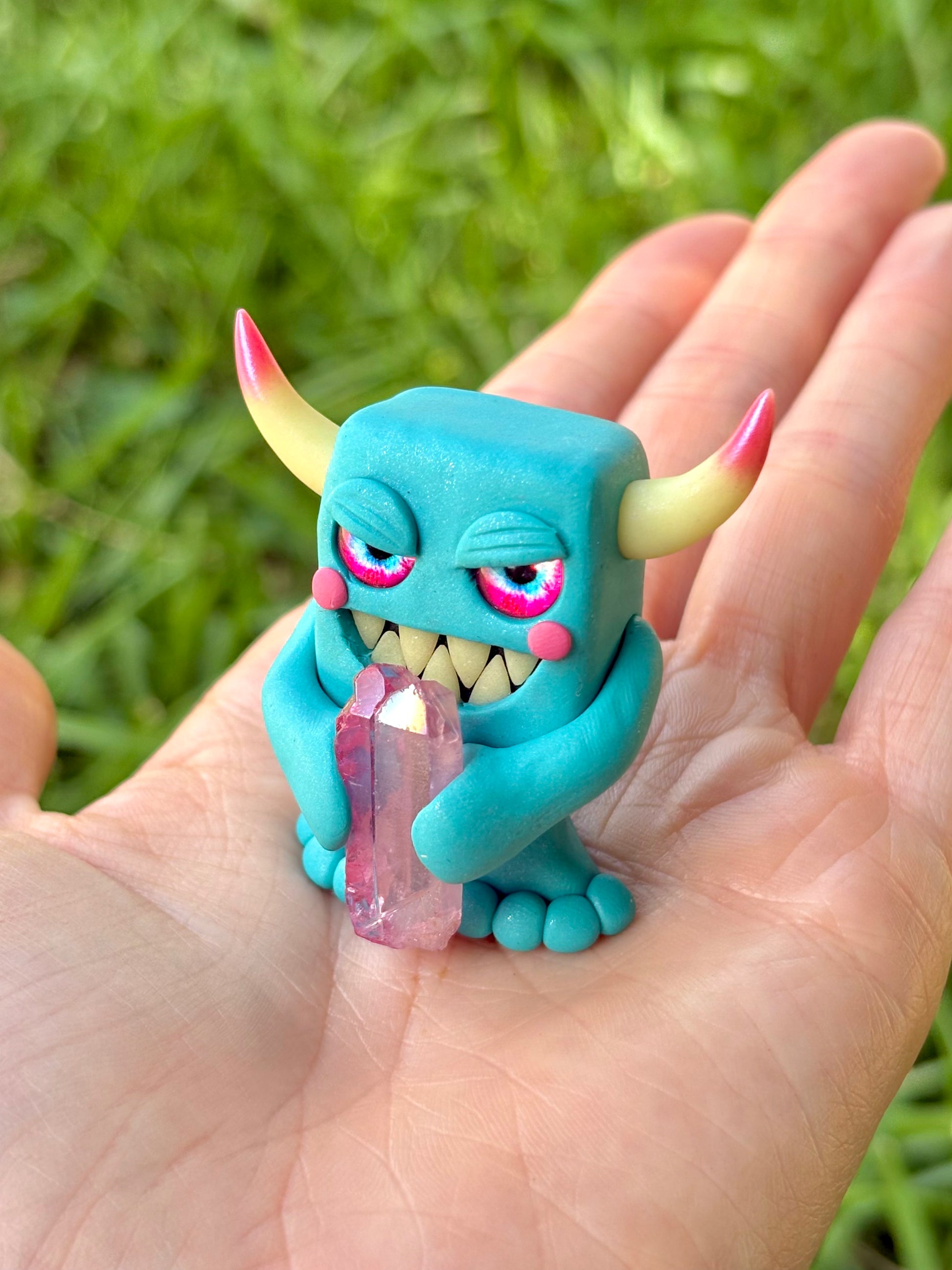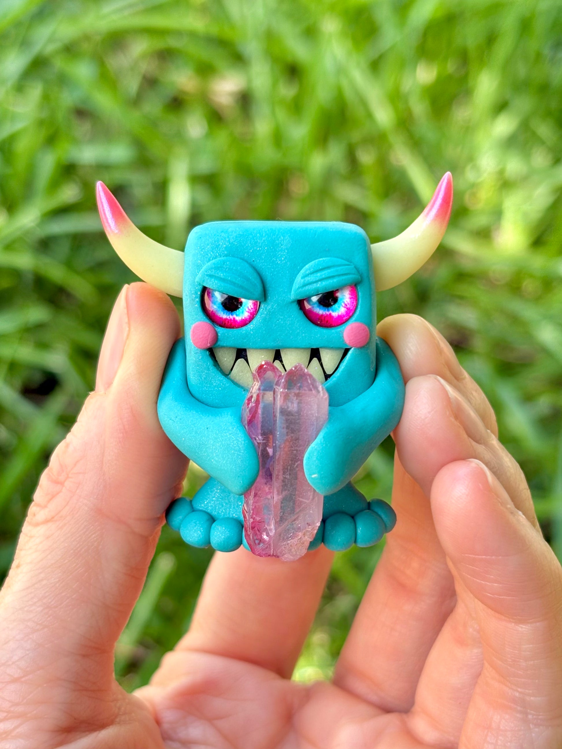 This handmade polymer clay Gem-lin figurine is holding a beautiful chunk of pink Aura Quartz.