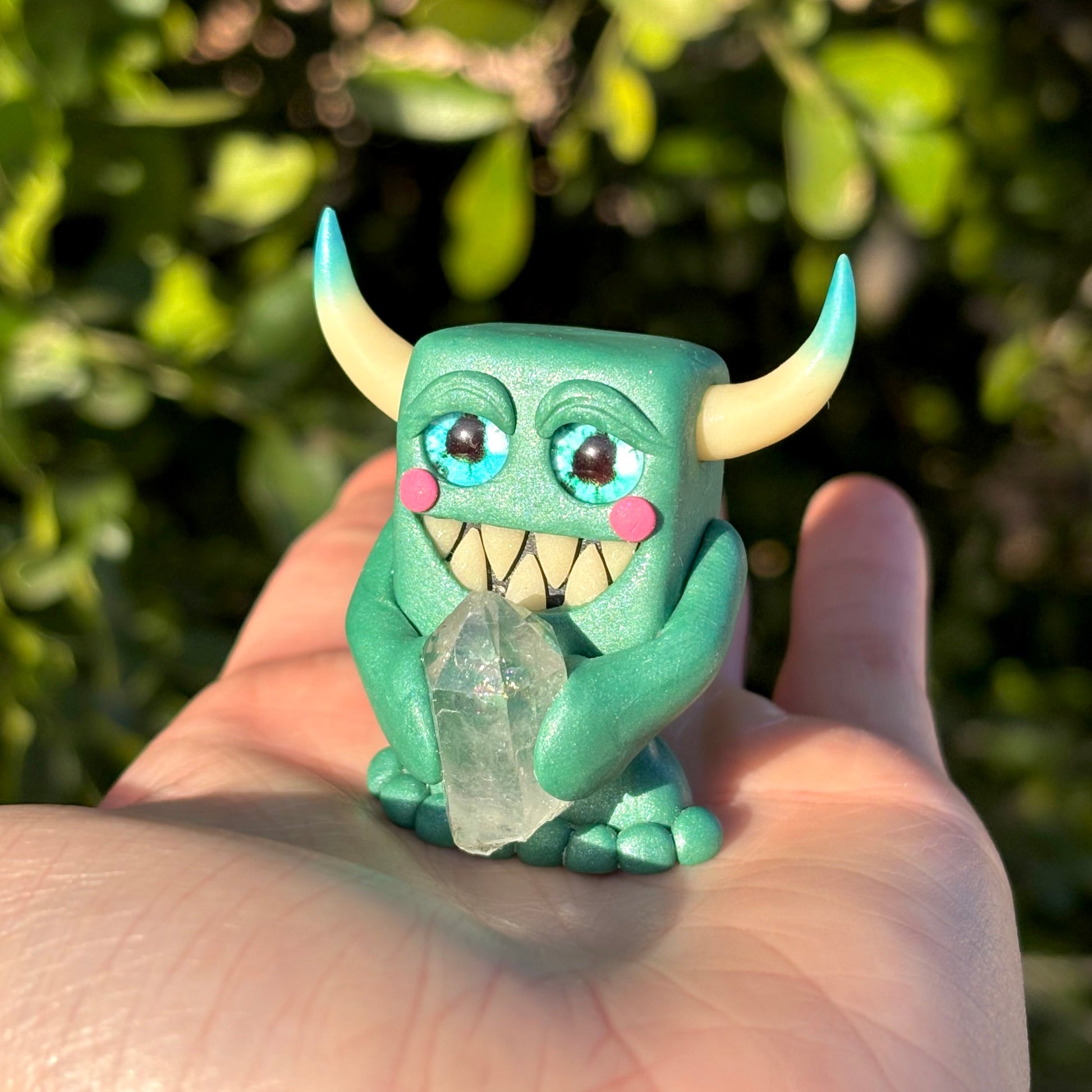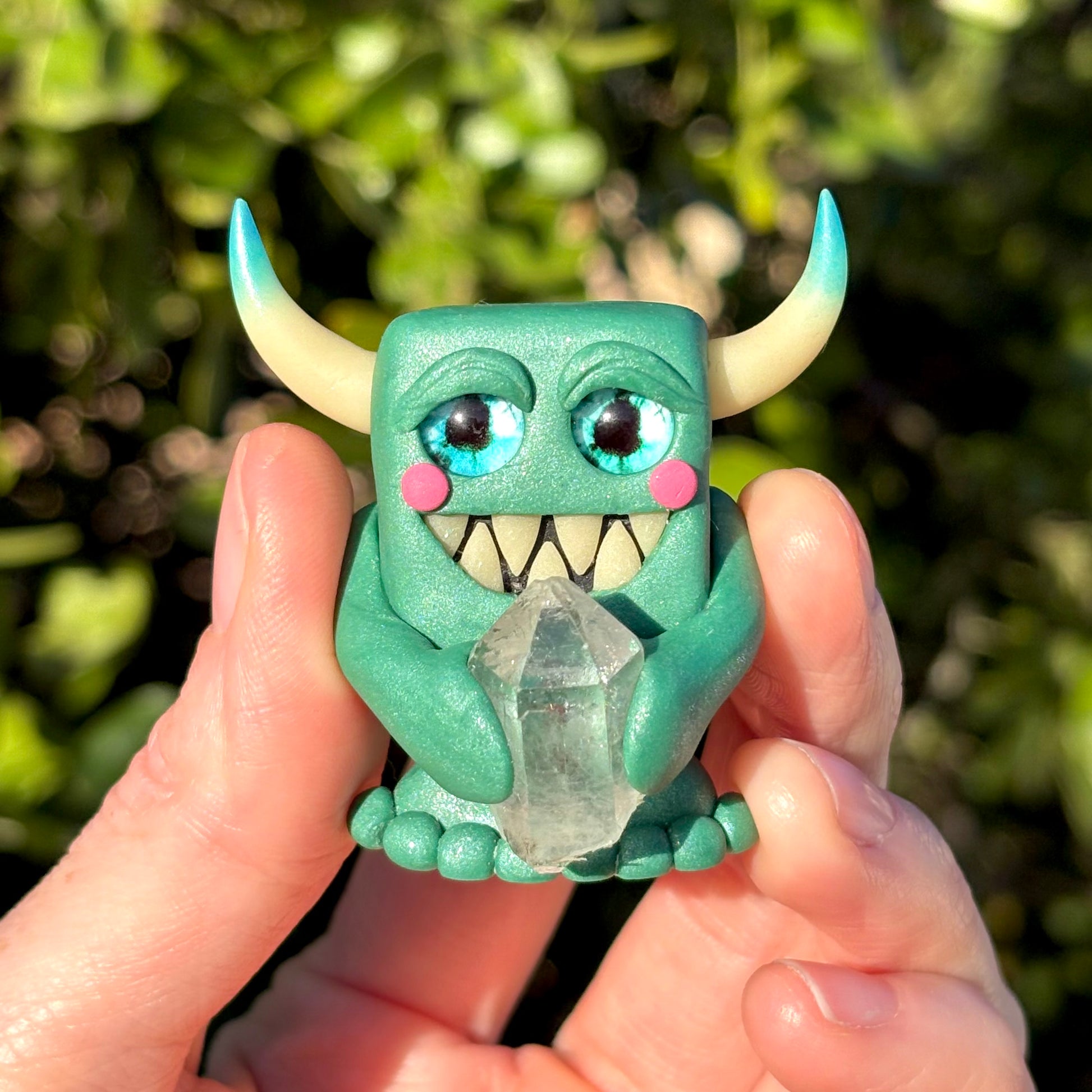 This handmade polymer clay Gem-lin figurine is holding a beautiful Quartz point.