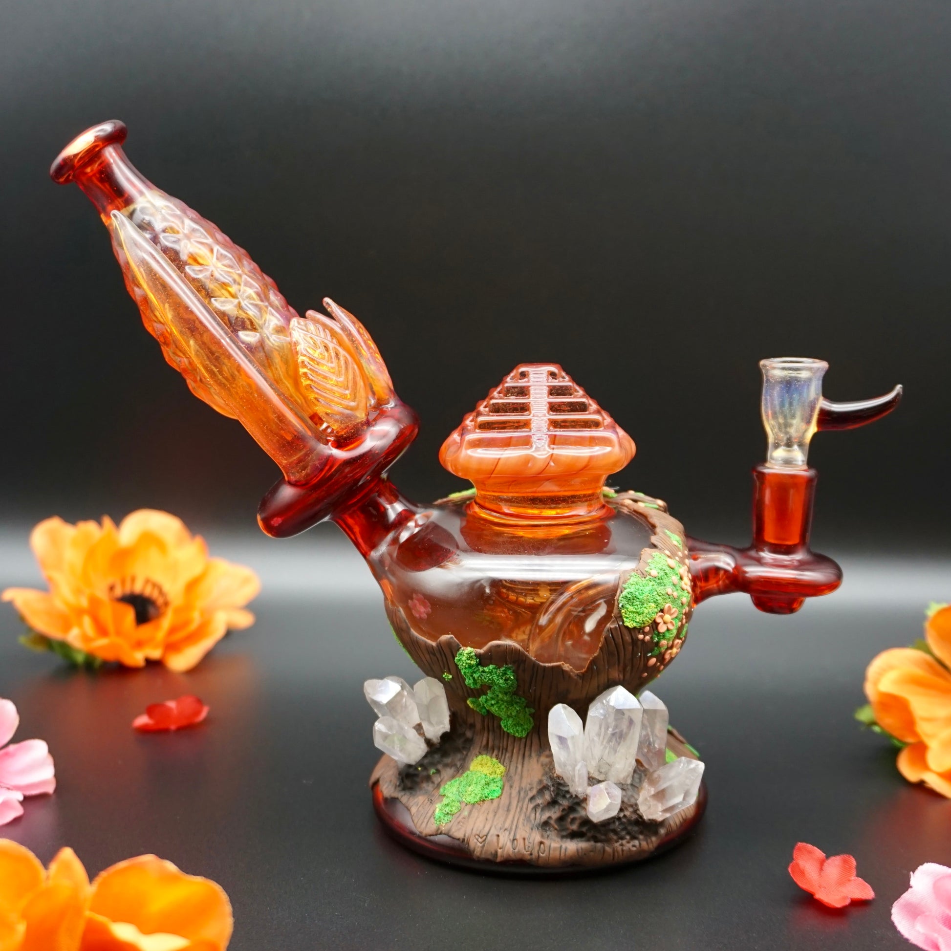 Handmade Polymer Clay sculpture on a gorgeous glass water pipe. This magic Forest themed piece features an iridescent scarab beetle and Aura Quartz Crystals. Comes with matching bowl.