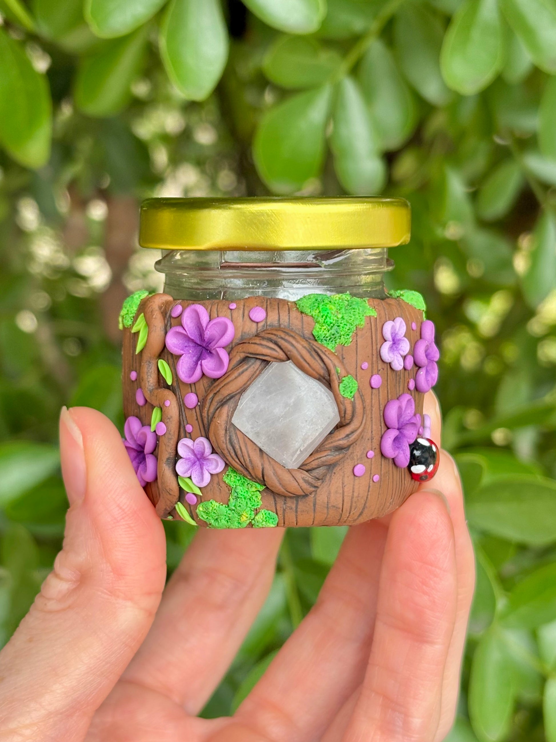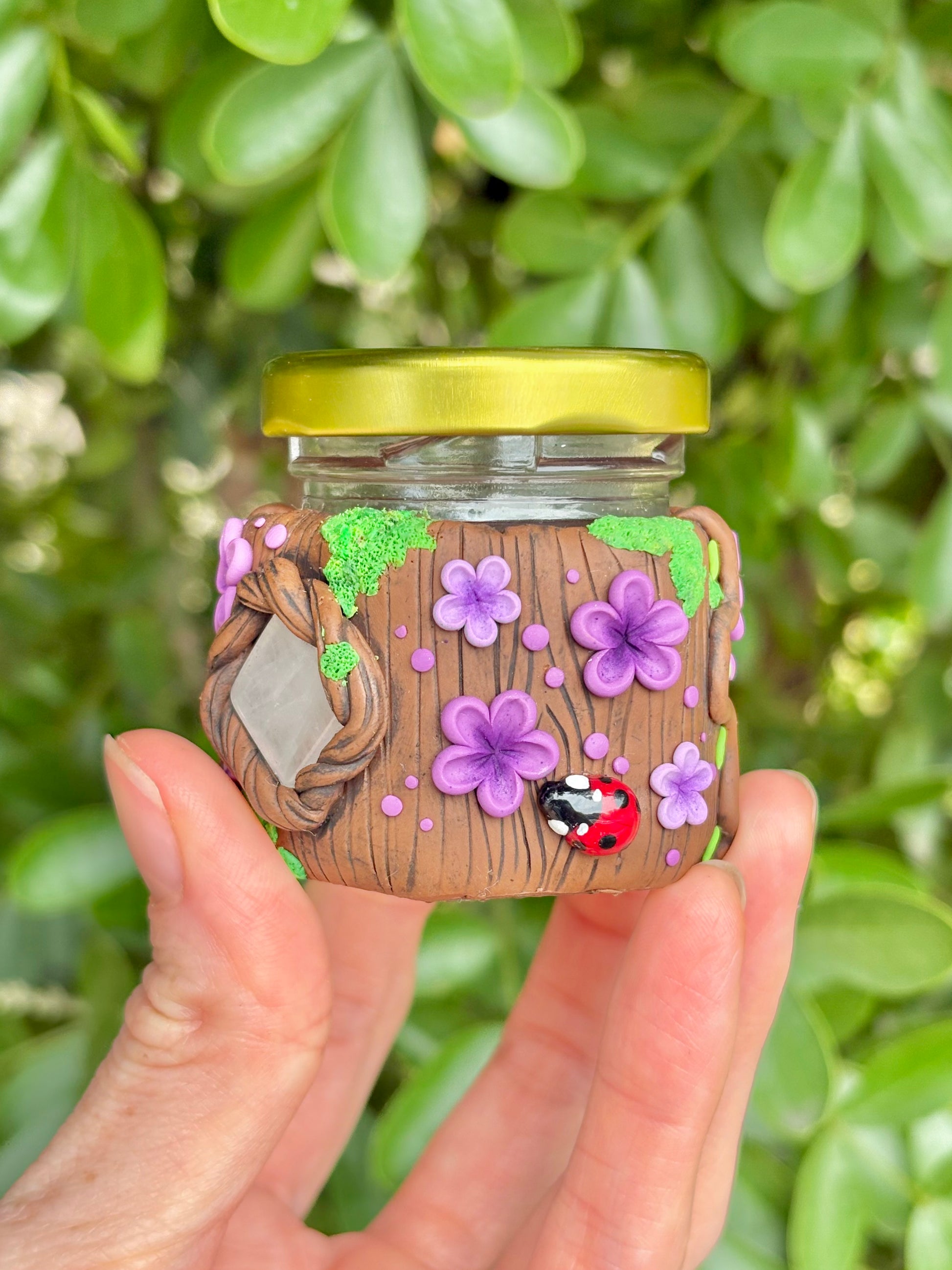 This woodland jar features a piece of rose quartz which radiates warmth and compassion. It’s surrounded by moss and vibrant purple polymer clay flowers.
