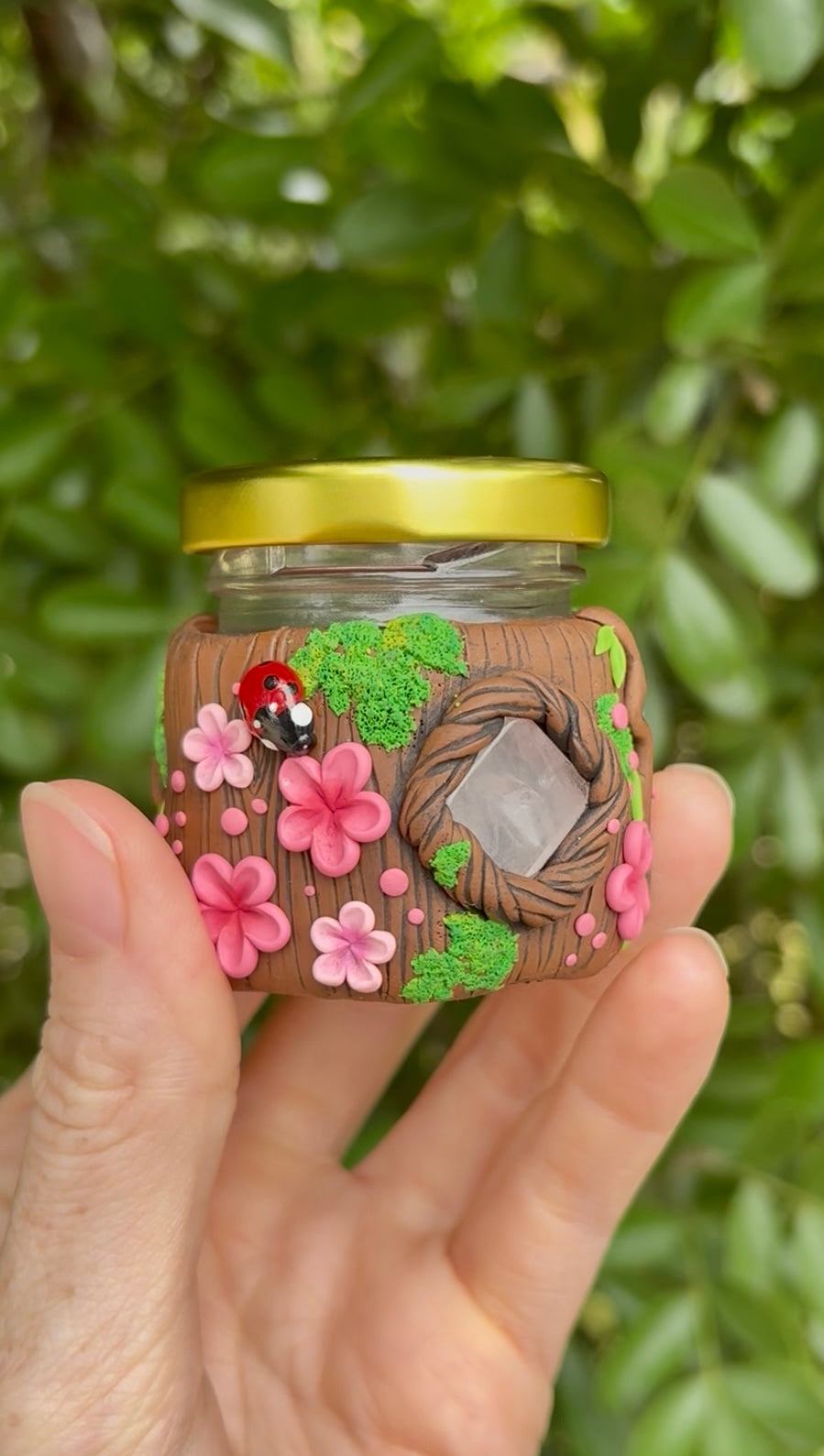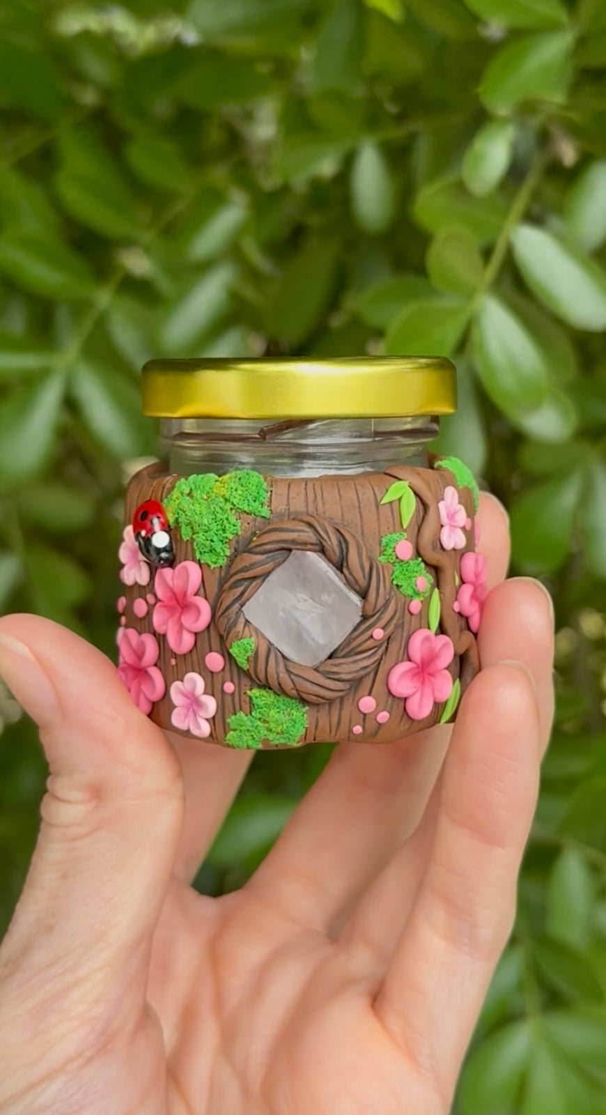 This woodland jar features a piece of rose quartz which radiates warmth and compassion. It’s surrounded by moss and vibrant pink polymer clay flowers.