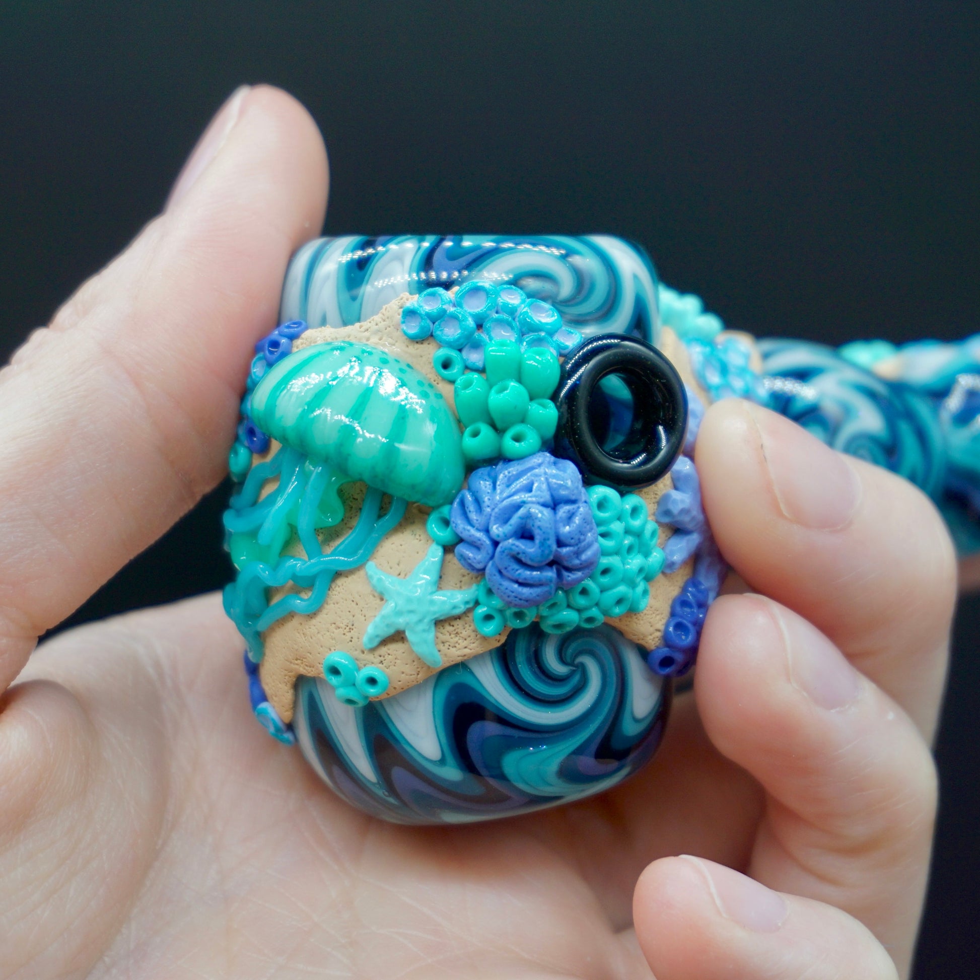 Handmade polymer clay beach sculpture on top of a beautiful wigwag hammer.