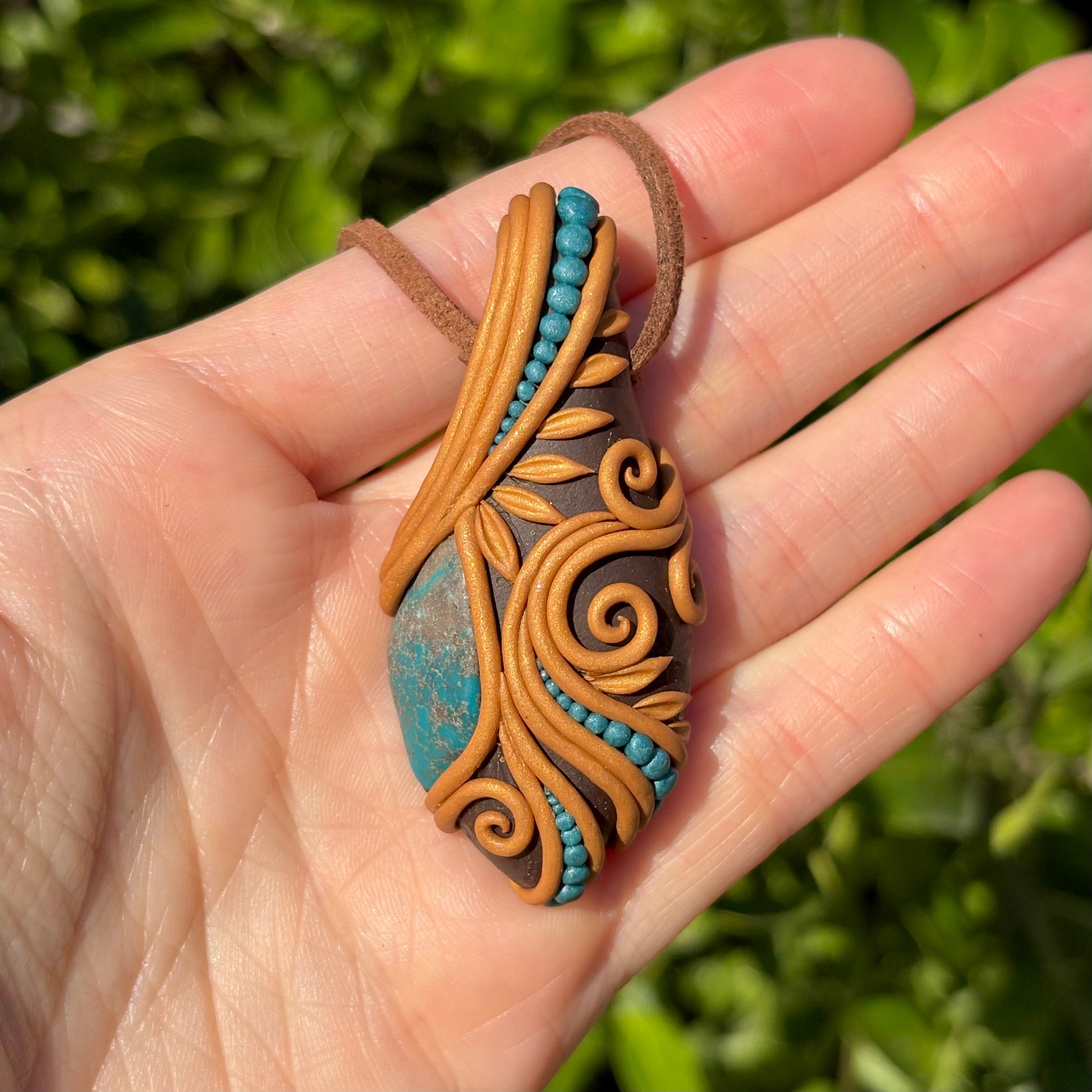 Real turquoise wrapped in polymer clay. Comes with suede cord.