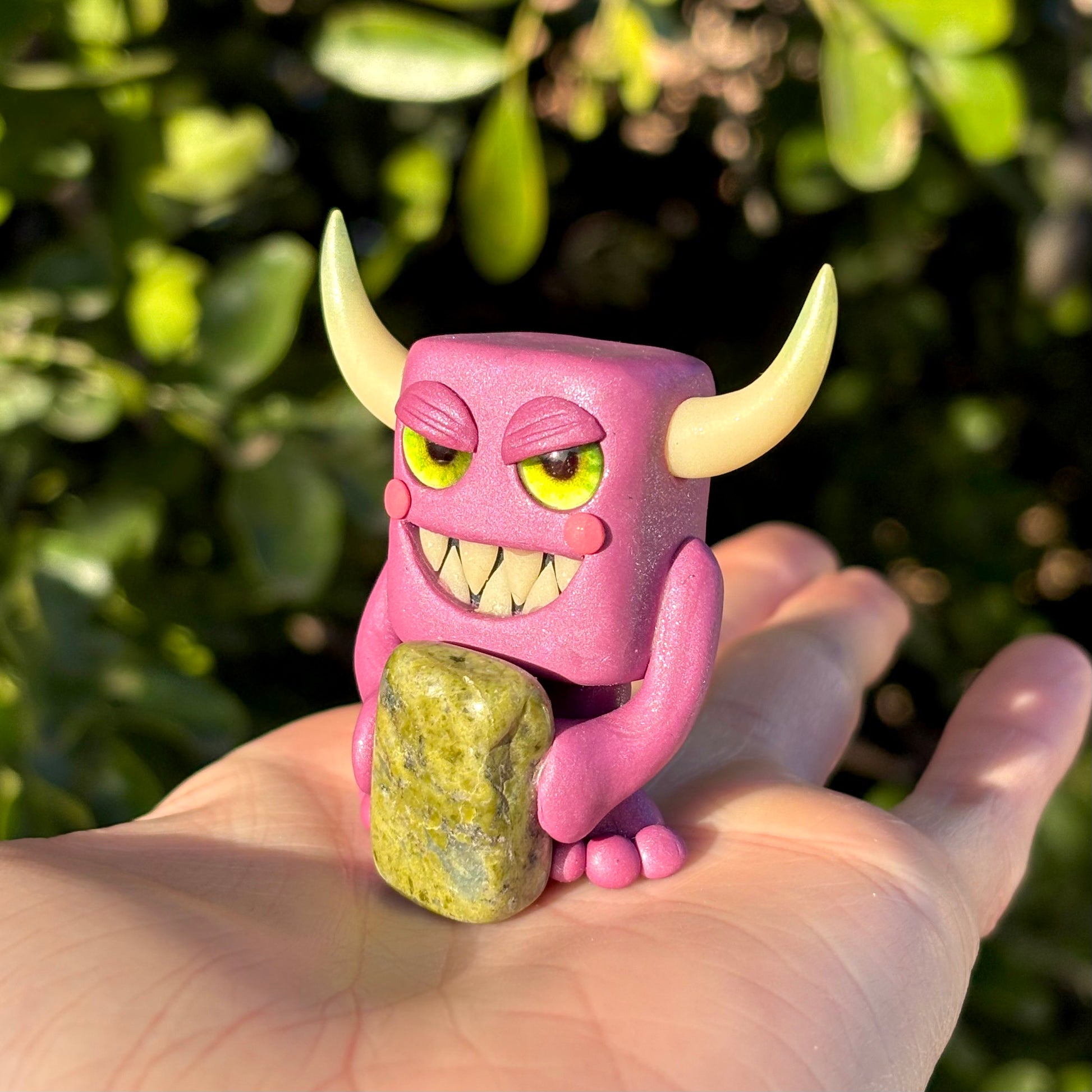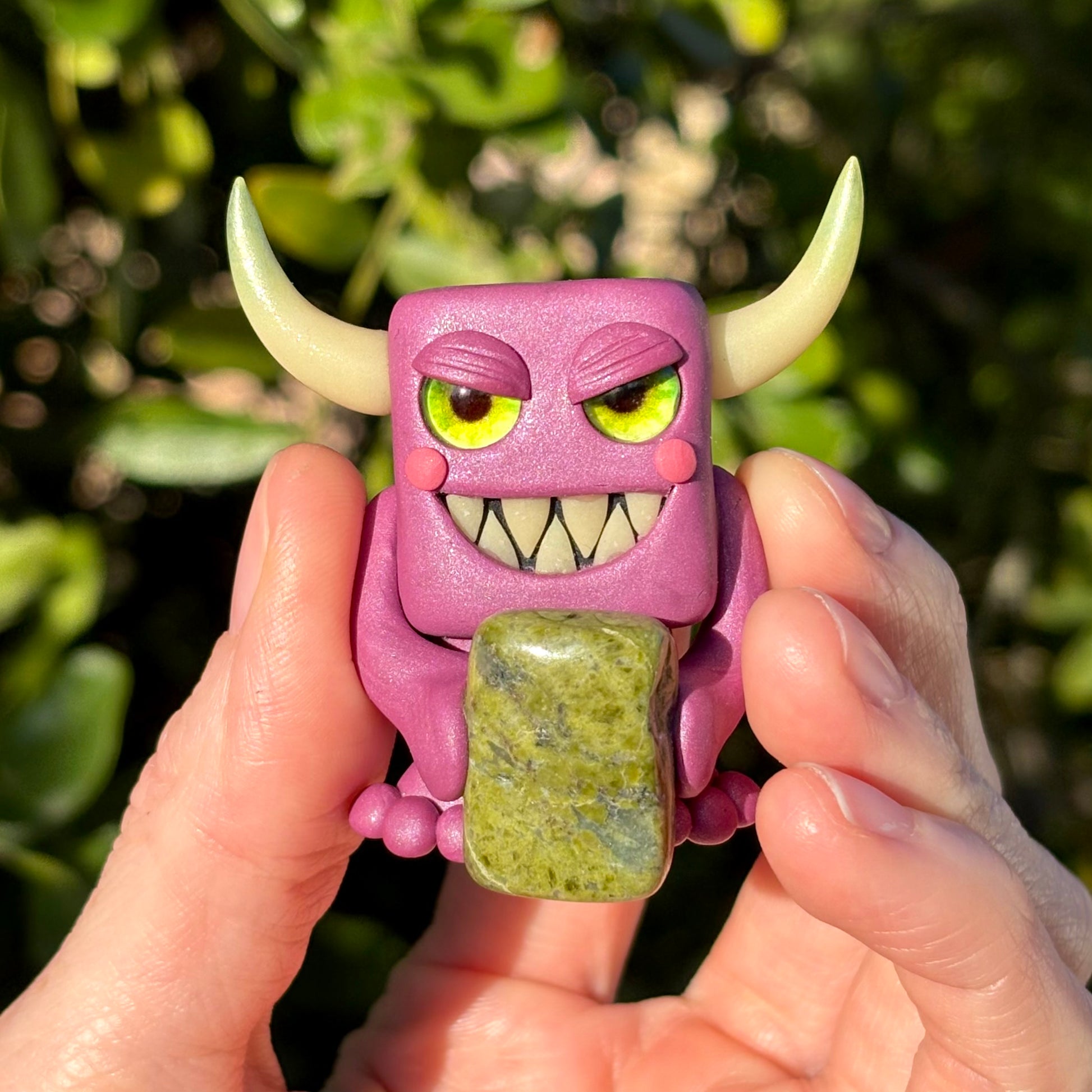 This handmade polymer clay Gem-lin figurine is holding a beautiful chunk of Unakite.