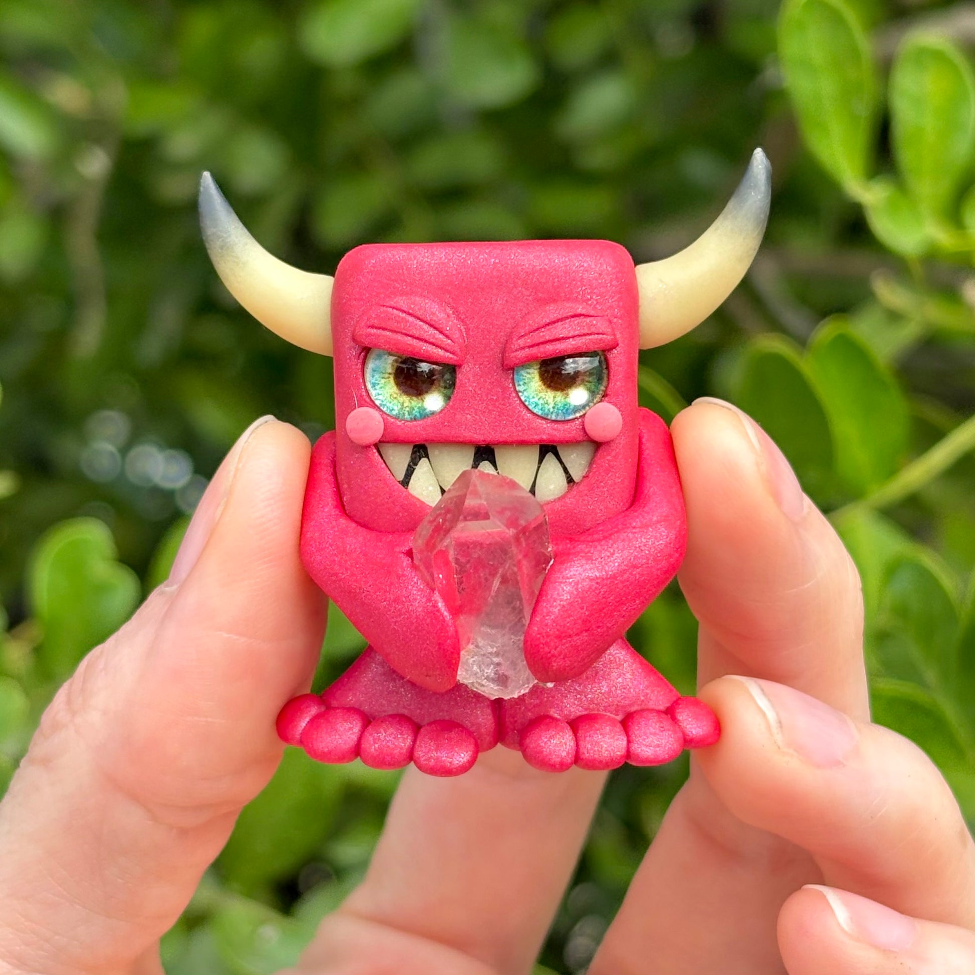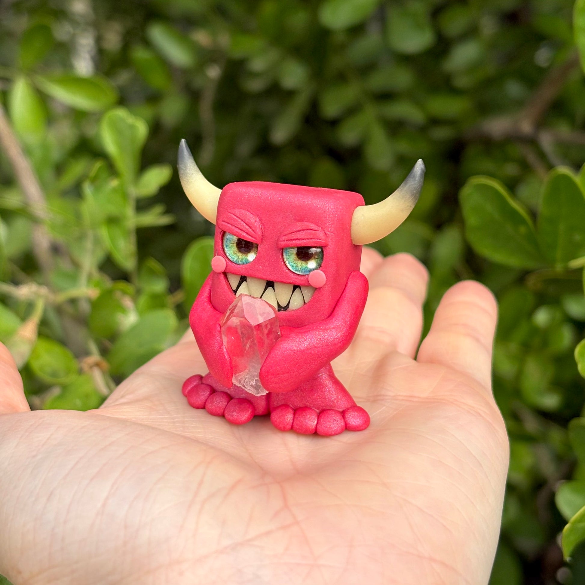 This handmade polymer clay Gem-lin figurine is holding a beautiful chunk of tumbled Rose Quartz.